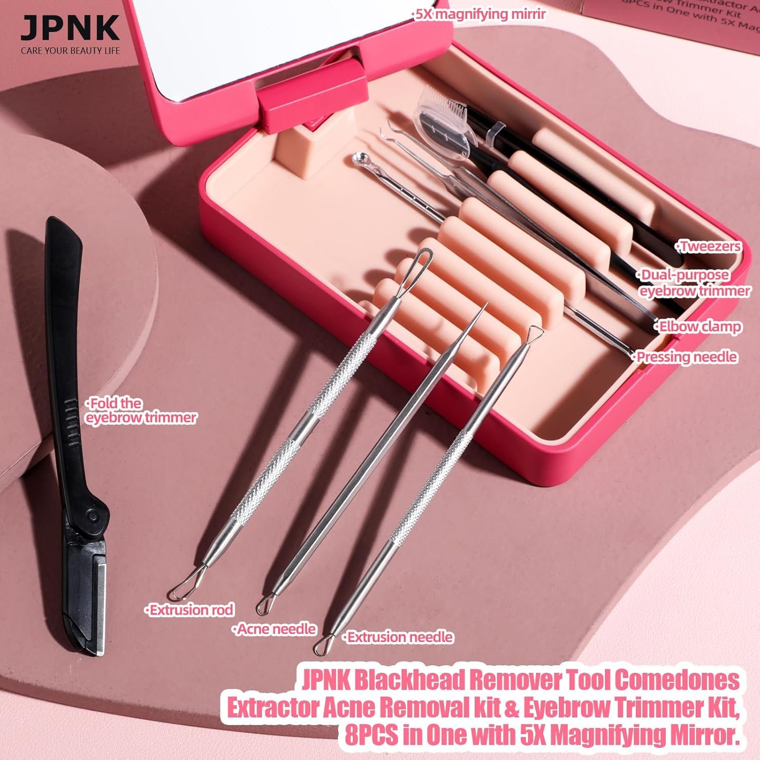 JPNK Blackhead Remover Tool Comedones Extractor Acne Removal kit & Eyebrow Trimmer Kit, 8PCS in One with 5X Magnifying Mirror (Silver)