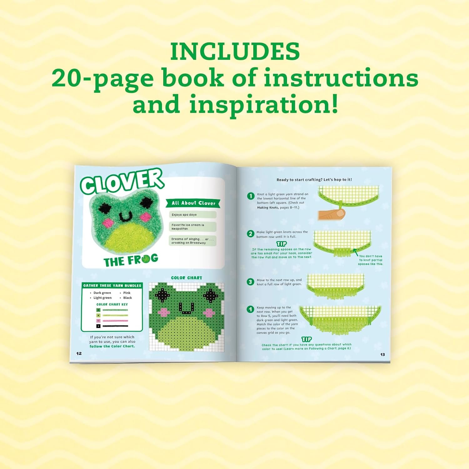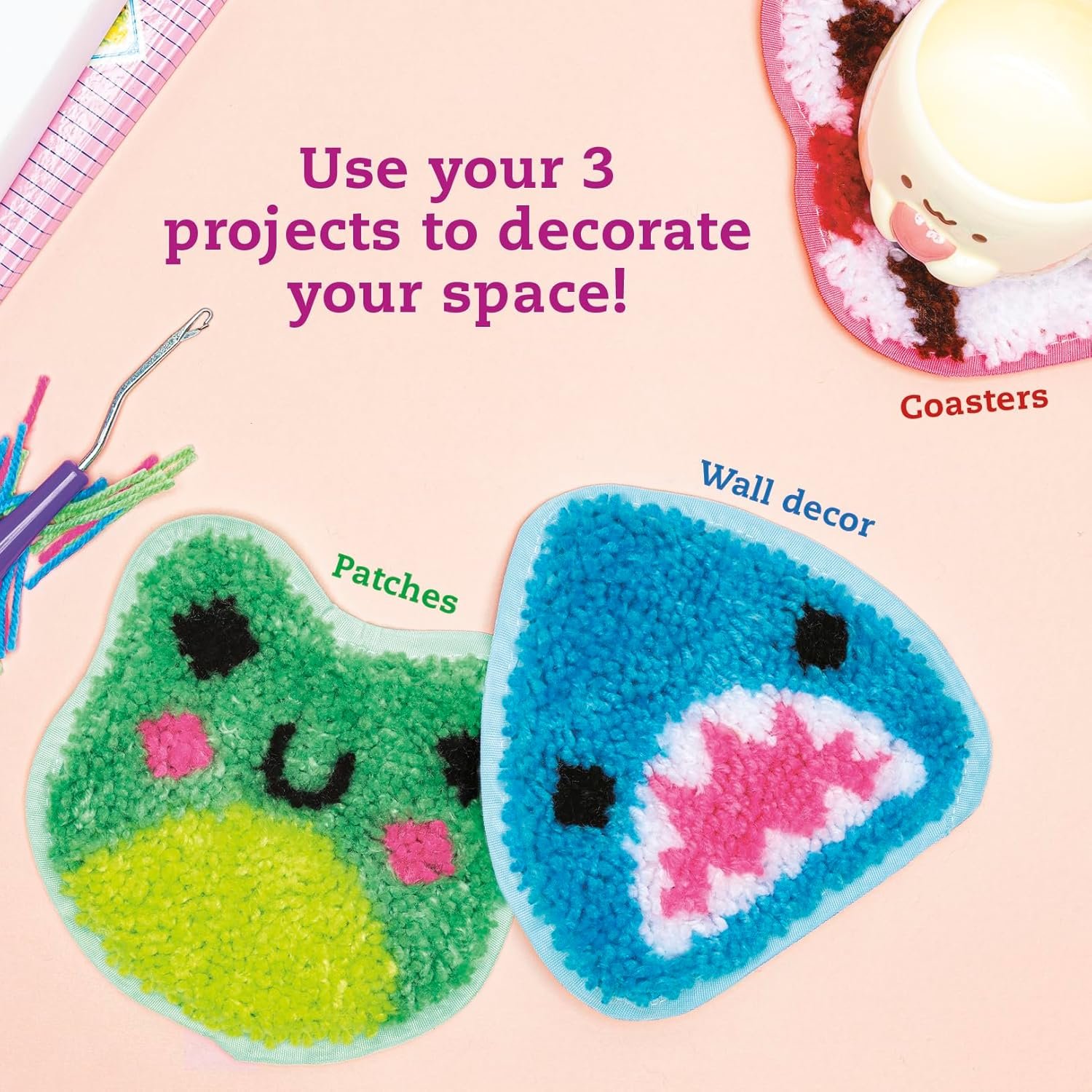 Make 3 fuzzy latch hook projects with canvas and yarn! A classic craft is back! Latch hook is easier than ever, with everything you need to make a frog, shark, and red panda. With mini (6 x 6 inch) canvases, precut yarn, and a custom tool, this kit helps take out the intimidation factor and get you into the latch hook groove. Each canvas is pre-shaped, pre-sewn, and color-coded to make crafting a snap. Show off your stuff on your walls, make a drink coaster, or decorate your locker with three adorable animals that bring this familiar craft to a new generation.