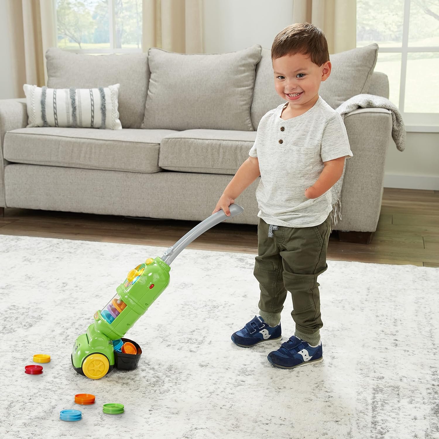 Count on picking up learning with the Pick Up and Count Vacuum ! This smart vacuum toy picks up ten play dust pieces as kids roll the vacuum over them, encouraging motor skills as they easily maneuver the pretend vacuum around the room. As the vacuum picks up the dust pieces, it recognizes each color and helps children with color recognition. Bouncing balls inside the spinning vacuum canister add excitement to pretend tidying. Three play modes teach colors, numbers and counting with six learning games. Five light-up panels illuminate to match the color of the piece the vacuum picks up, and the vacuum says the color name and counts the piece to reinforce learning. The tiltable handle adjusts to multiple heights, allowing this toy to grow with your child. A dust bin on the back collects and stores all ten dust pieces. Clean up on learning! Intended for ages 2+ years. Requires 4 AA batteries. Batteries included for demo purposes only. New batteries recommended for regular use.