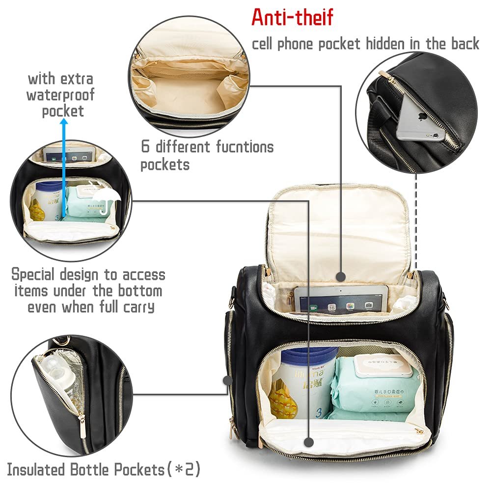 Best Gift for New Mom: Our leather baby bag (15.4*6.7*13.4 Inch, Weight : 2.8 lb) comes with a changing pad (26 x 17 Inch). Two large compartments and 9 pockets (including 5 external pocket, a waterproof pockets, a zipper Anti-theft smart phone pocket, 2 insulated zipper bottle pockets), make the baby diaper bag enough to satisfy everything you need without being too large or too small.