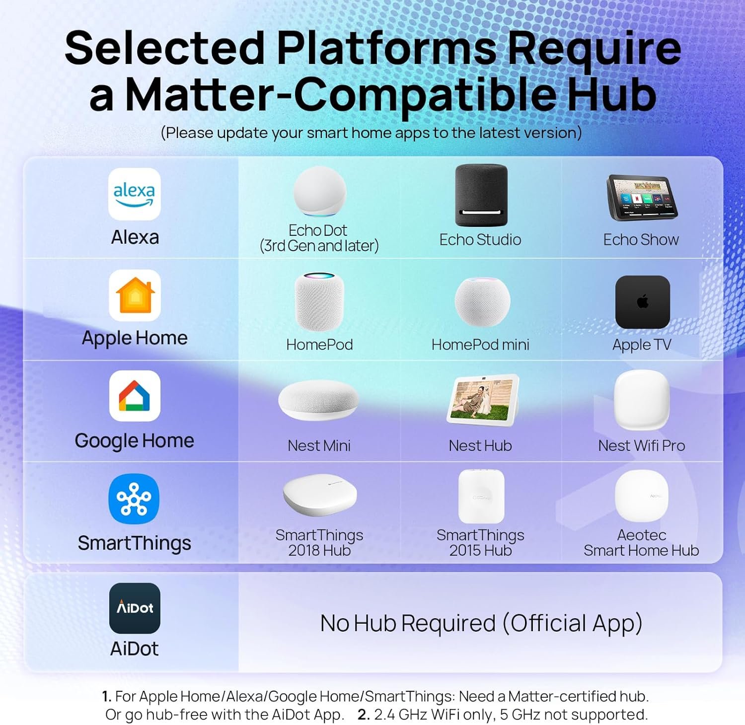 【Powerful Smart Matter】Linkind 120V smart light bulb is certified for Matter platform used for integrating all your smart home devices into one control system, fitting for users with multiple smart gadgets. It eliminates the need for switching between multiple apps, enhancing your smart home experience. It works seamlessly with Matter-certified hubs (HomePod, Echo, Nest etc.) allowing for multi-platform control, or directly via AiDot app with no extra hubs needed, offering flexible usage for different home setups.