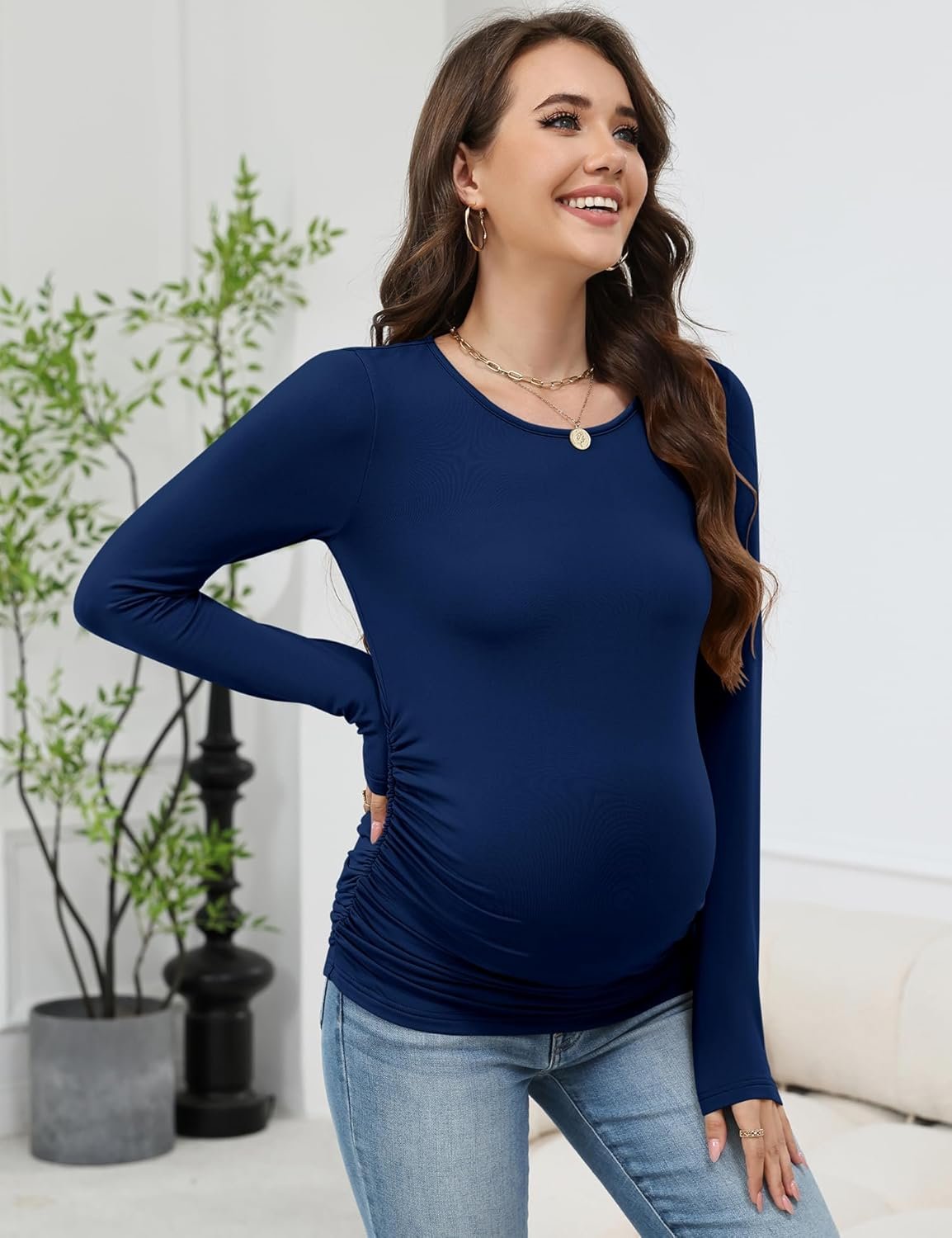 LOMON Maternity Shirts Long Sleeve Thermal Tops Side Ruched Casual Tshirt Crewneck Fleece Base Layer for Pregnant Women