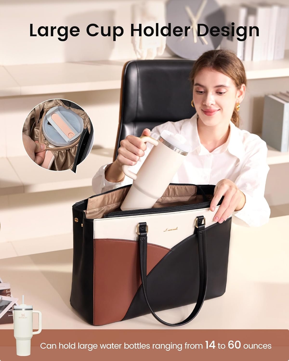 【 Extra-Large Capacity, Convenient Storage】 This laptop tote bag for women features a scientifically organized interior. With a main compartment, a separate large water bottle pocket,a separate padded laptop bag sleeve, and multiple interior and exterior pockets, it easily holds a 15.6-inch laptop, tablet, documents, and essentials. Whether used as a work tote bag, teacher tote bag, or computer tote bag for women, it keeps your computer tote bag neat and boosts both efficiency and elegance.