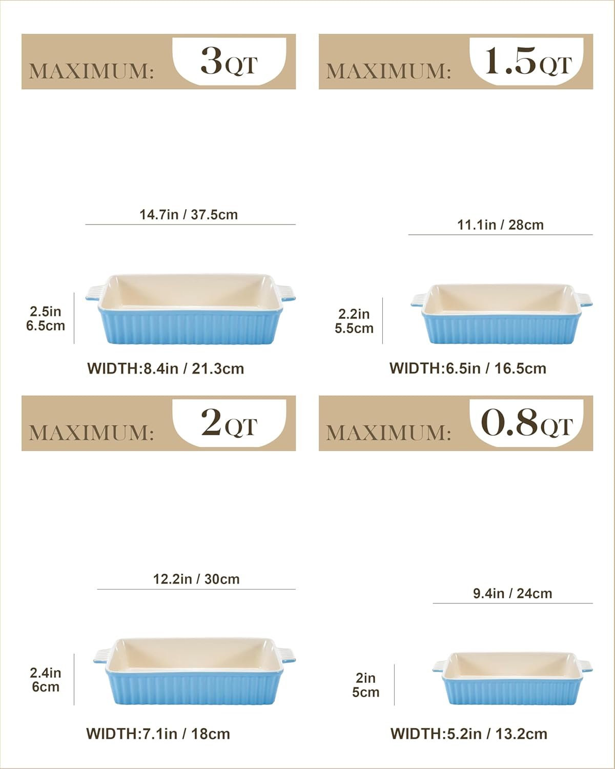 【4 SIZES TO MEET ALL NEEDS】(Including handles size) ① 14.7″L x 8.4″W x 2.5″H, 3QT ② 12.2″L x 7.1″W x 2.4″H, 2QT ③ 11.1″L x 6.5″W x 2.2″H, 1.5QT ④ 9.4″L x 5.2″W x 2″H, 0.8QT. This oven bakeware set can meet all your needs in the kitchen, from individual servings to large family meals, you can effortlessly find the perfect size.