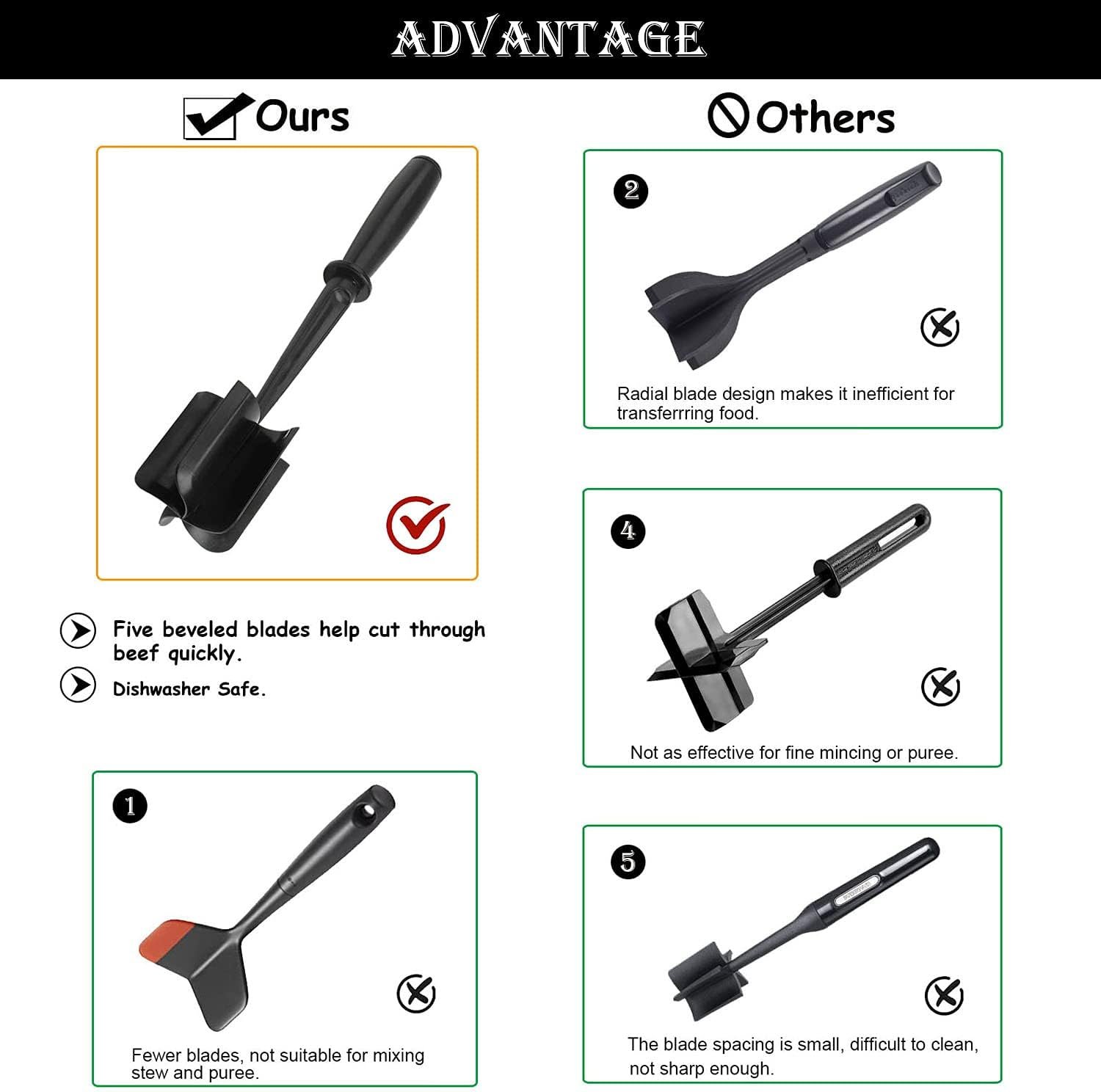 Meat Chopper, Ground Beef Masher with 5-Blade Head, Versatile High-Temp Heat-Resistant Hamburger Masher, Nylon Non-Stick Meat Masher, Kitchen Aid (Black)