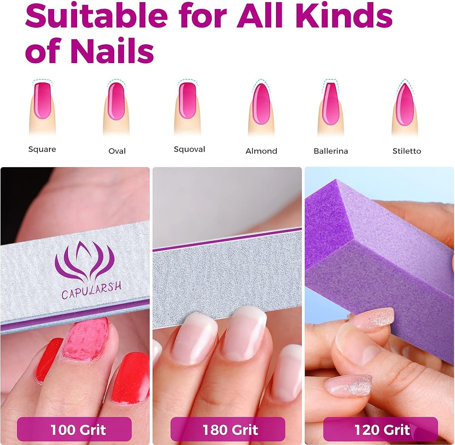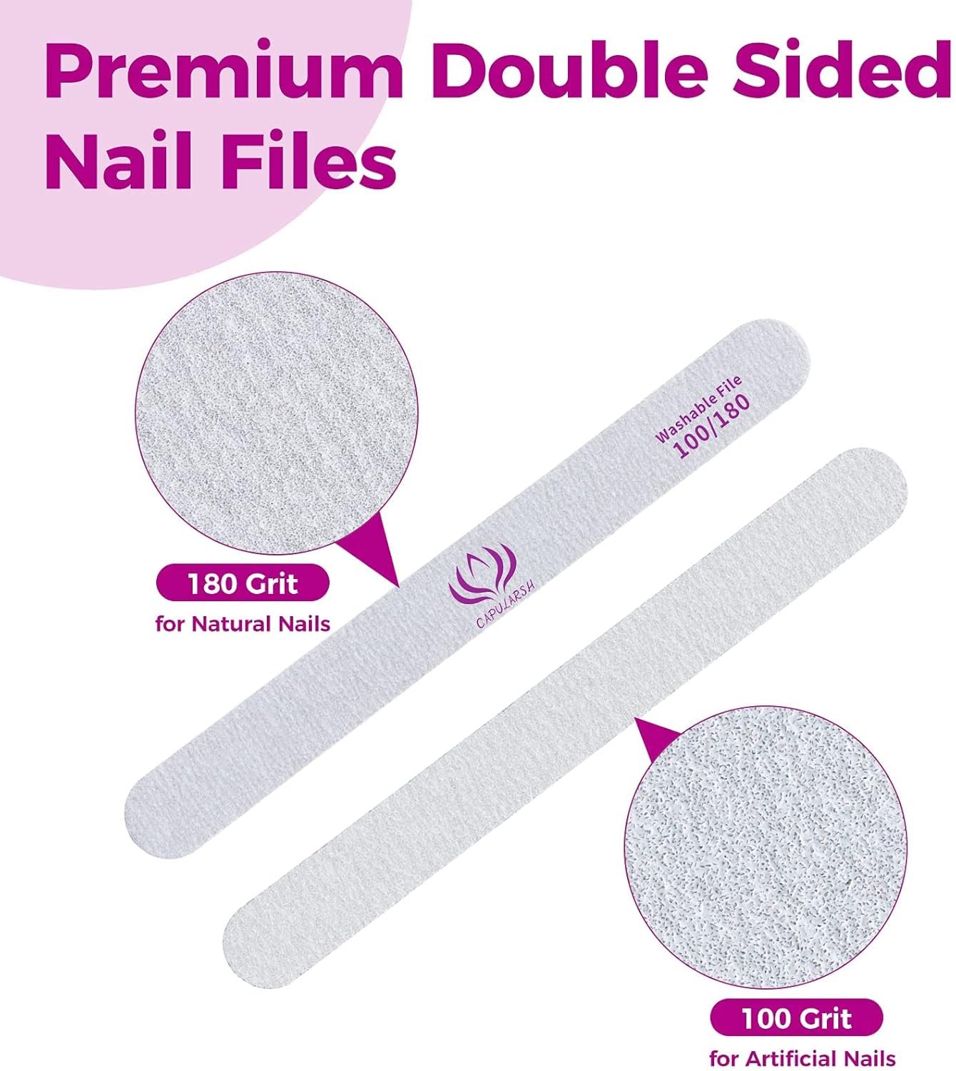 Double-Sided Nail File: 100 grit is ideal for filing or shaping for a desired shape or length, while 180 grit(with words) is for polishing rough edges into delicate shapes, making your nails more beautiful.