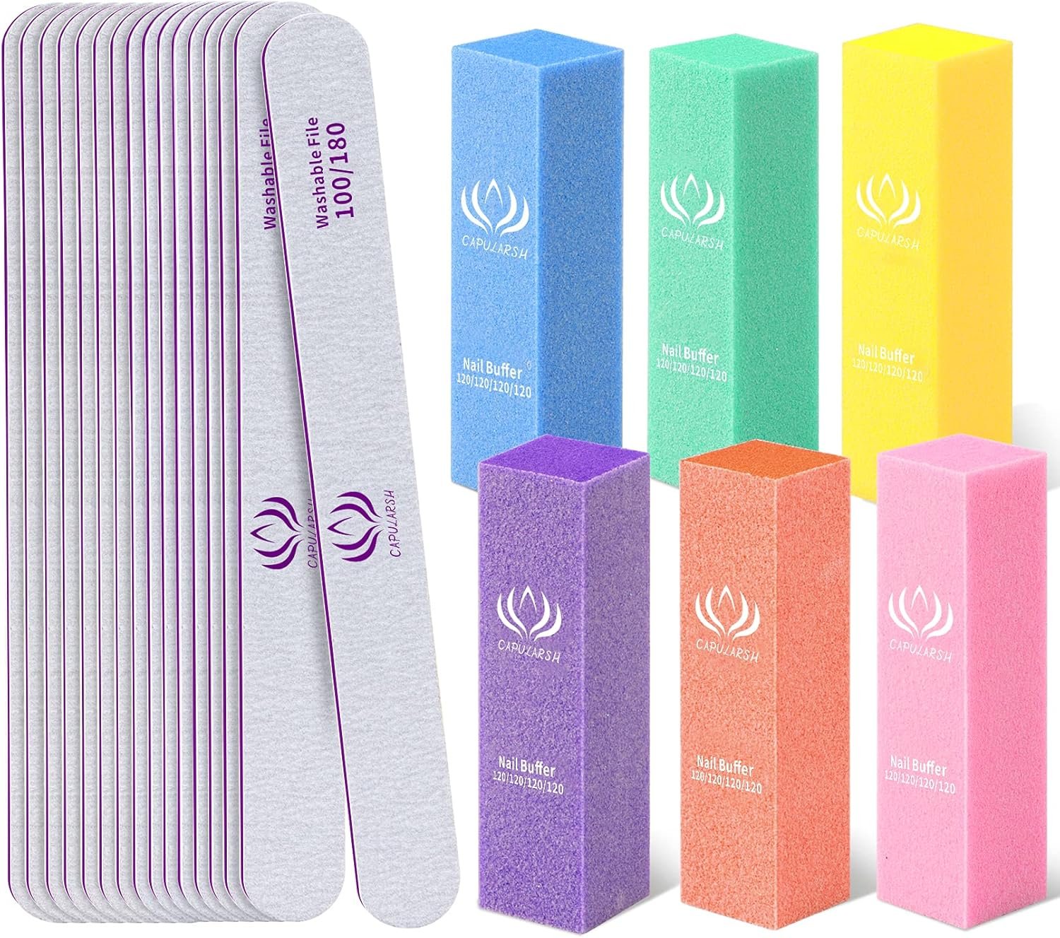 Nail Files and Buffers – Capularsh 16Pack Professional Manicure Tools Kit, 10Pcs 100/180 Grit Double Sided Nail Files for Acrylic Dip Nails, 6Pcs Four Sided 120 Grit Nail Buffer Block for Home Salon