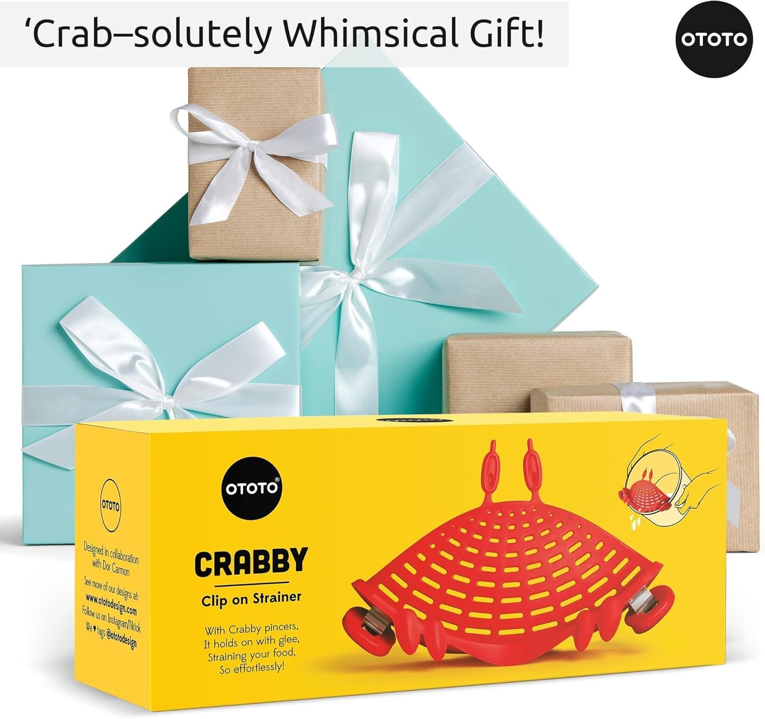 NEW Crabby Clip-On Strainer by OTOTO – Silicone and Stainless Steel Pasta Strainer, Funny Gifts, Cute Kitchen Accessories, Red Crab, Cool Kitchen Gadgets