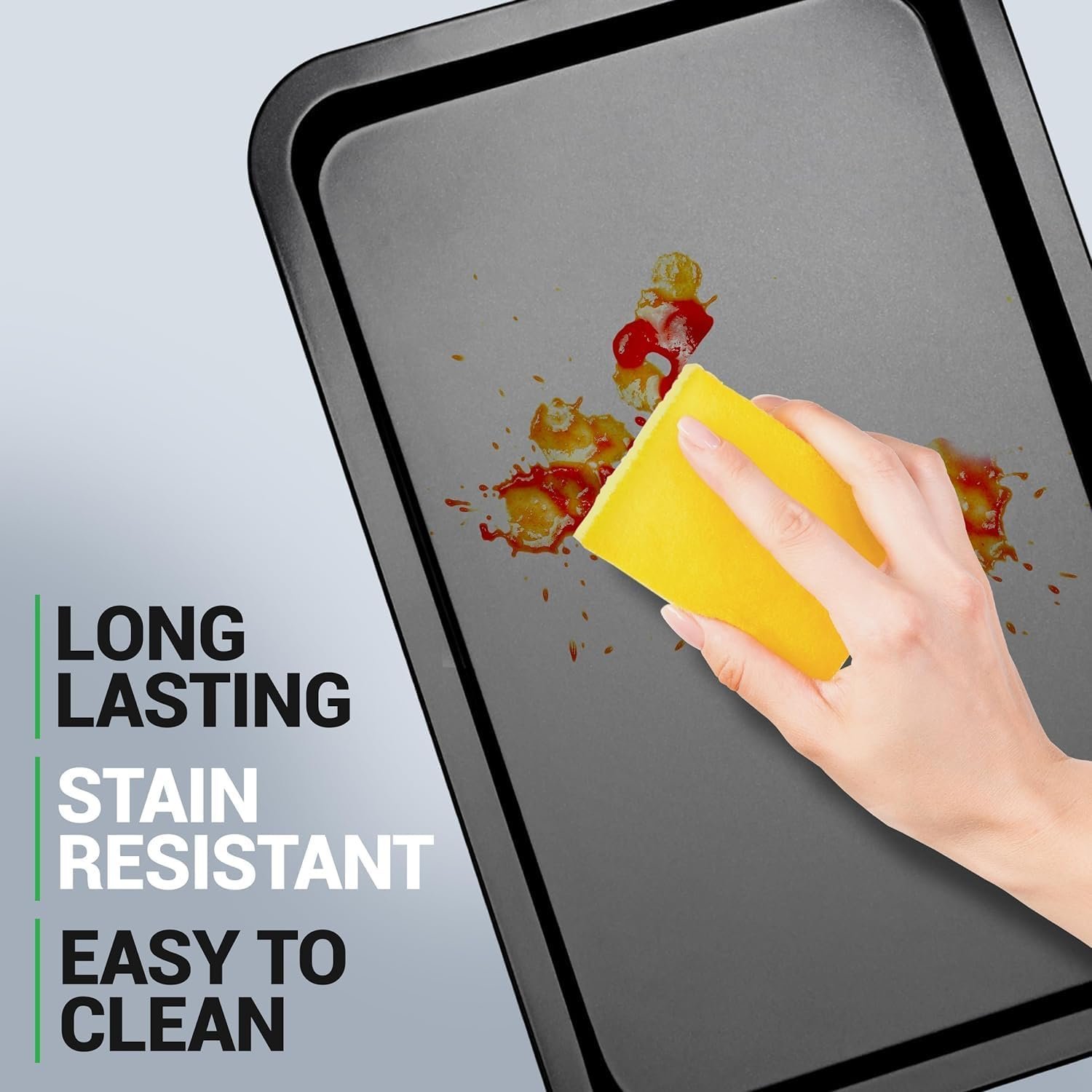 COMMERCIAL GRADE – Proper pans and utensils are what set a professional apart from the regular home chef. Unlike the bottom of disposable pans, the smooth metal base of these baking sheets results in a feast for the eyes and palate. In addition, each non-stick baking pan in this bulk set provides even heat distribution, helping your dish become a restaurant worthy delight. This collection is compatible with standard or convection ovens; heat-safe at high temperature up to 550˚F.
