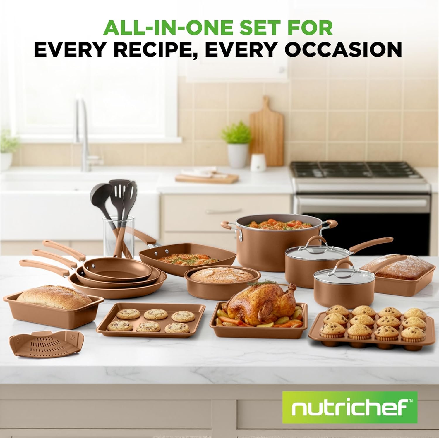 Nutrichef 20 Piece Professional Home Kitchen Cookware and Bakeware, Pots and Pans Set Non Stick Kitchenware, Cool-Touch Handles, Non Toxic, Safe for Gas, Electric, Induction Cooktops, Easy Clean