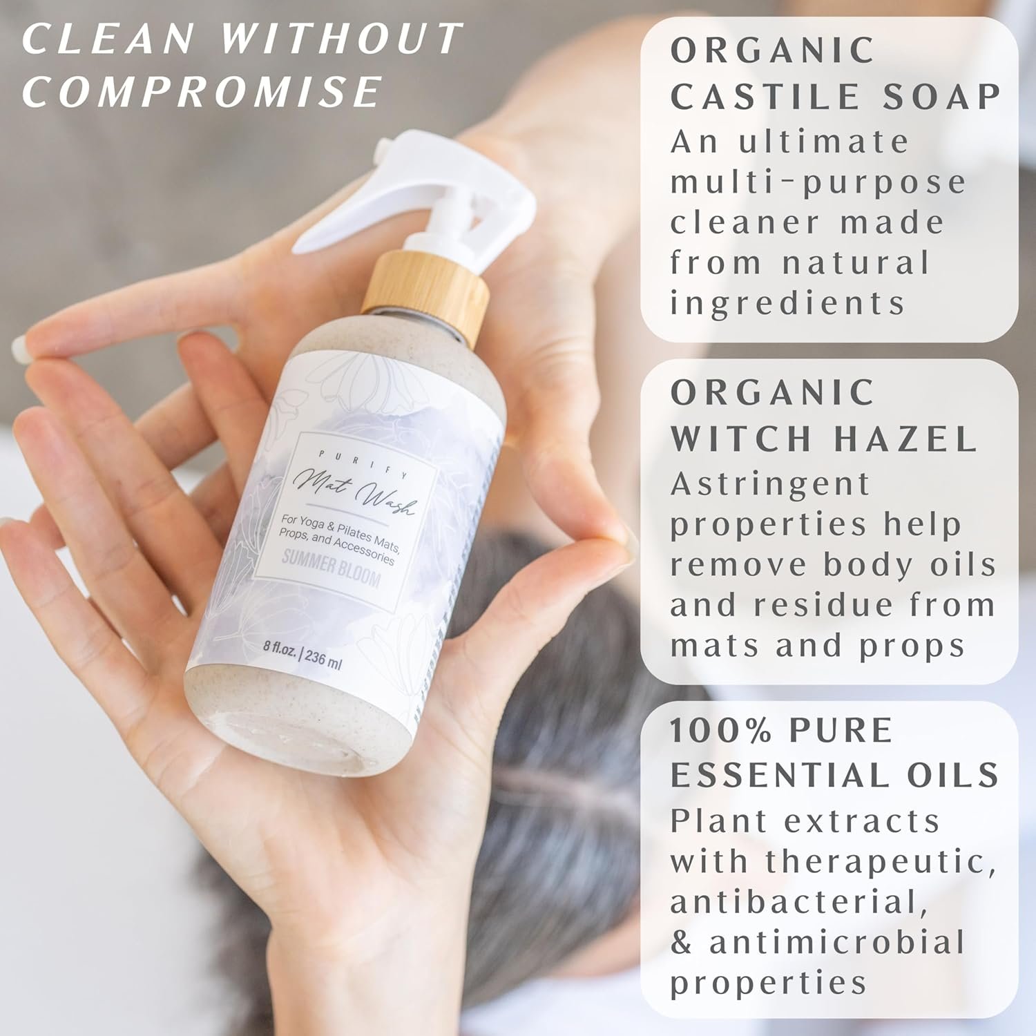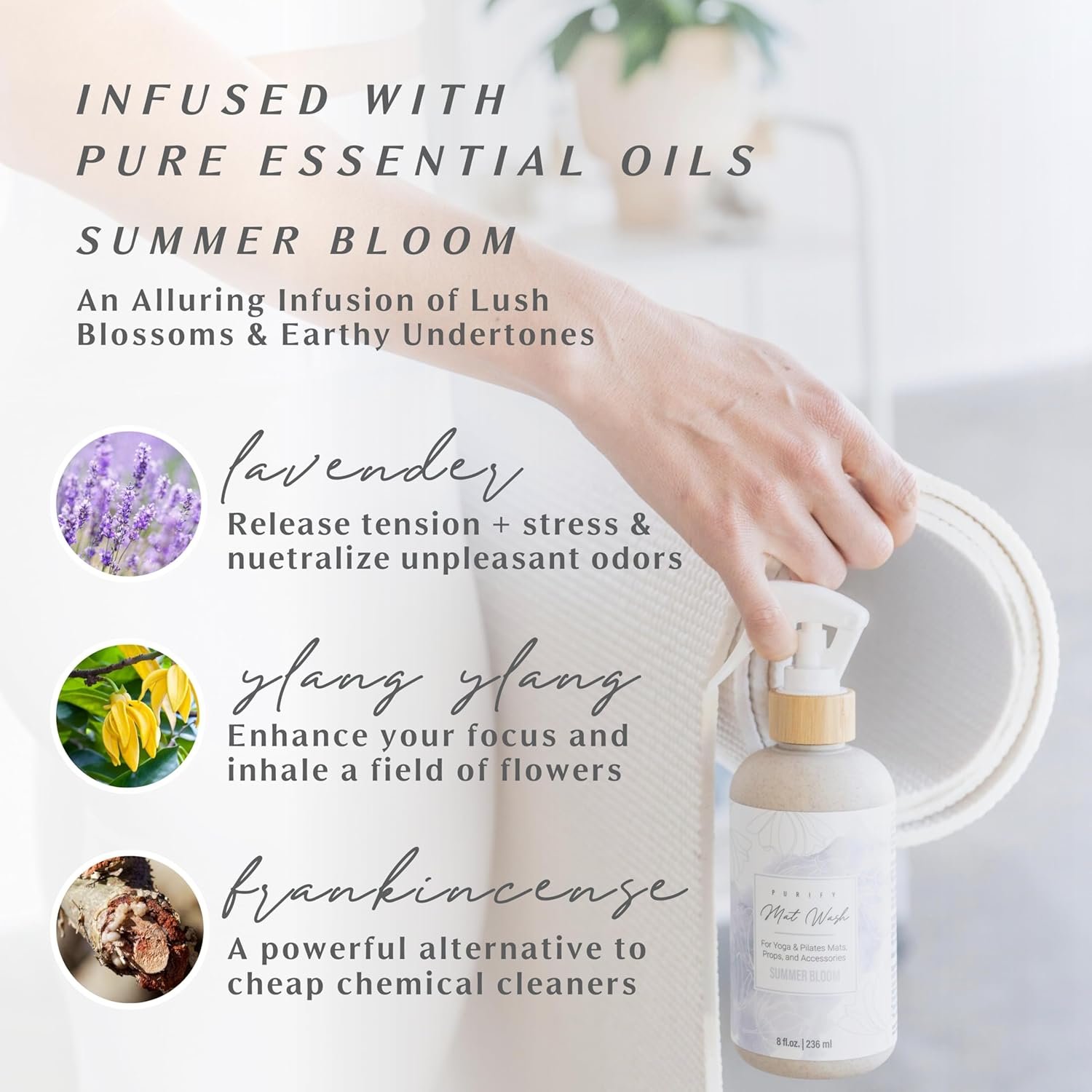 Organic Yoga Mat Cleaner Spray | 8oz Summer Bloom with Microfiber Cloth | Made in the USA | Safely and Effectively Cleans All Mats and Pilates + Yoga Accessories