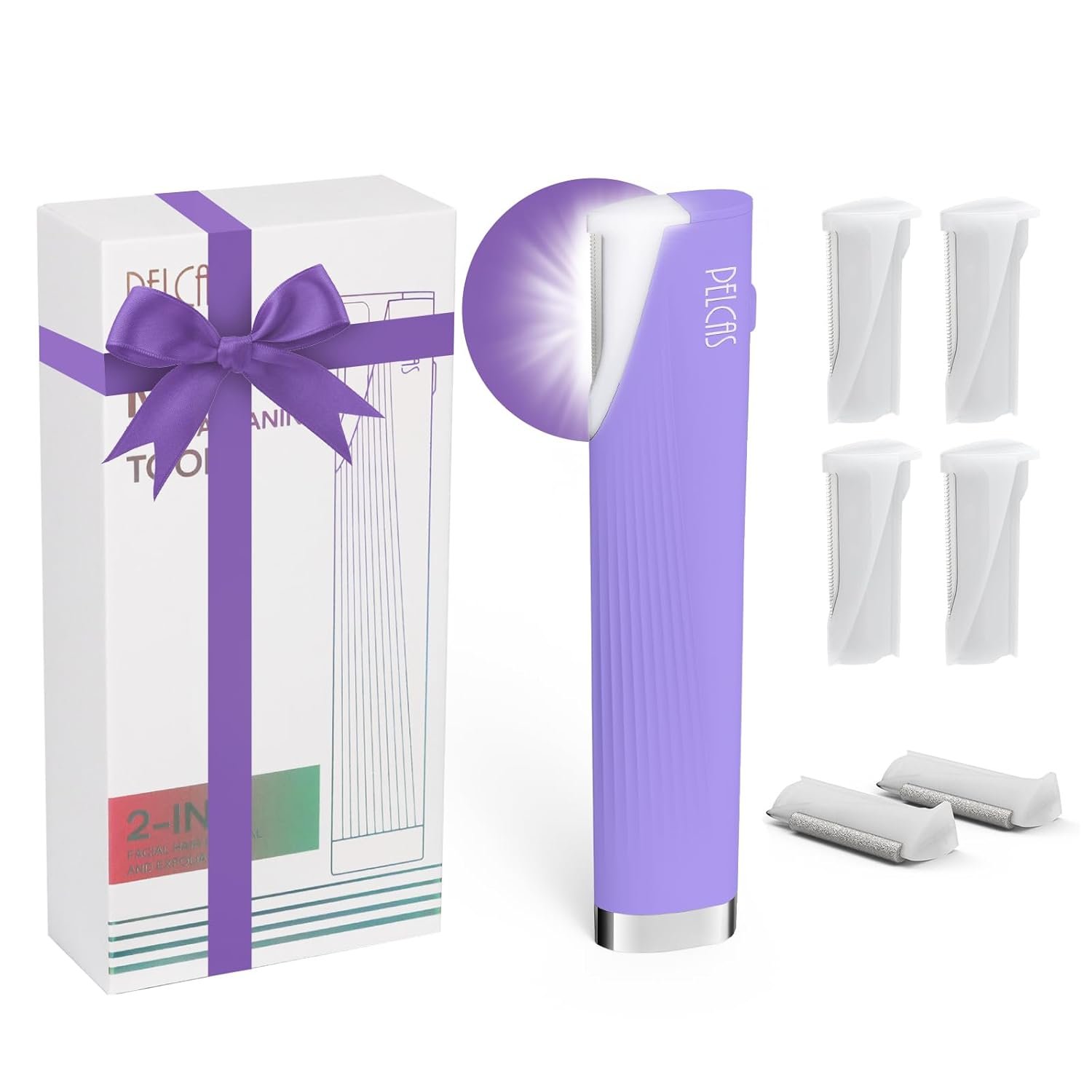 PELCAS Electric Dermaplaning Tool for Women Face with LED Light 3 Speeds Mini Dermaplaning Razor with 6 Blades, 2 in 1 Facial Peach Fuzz Hair & Exfoliation Removal System At Home BV18-712 Light Purple