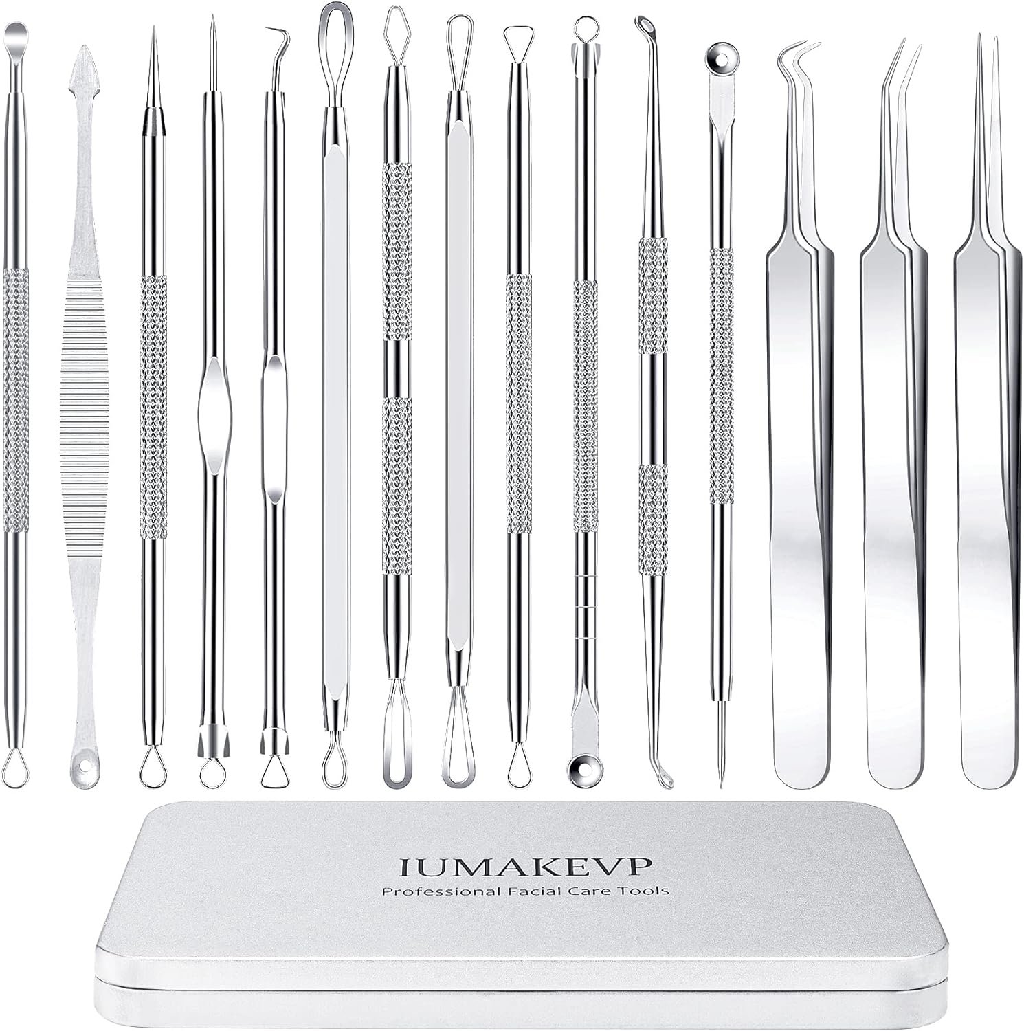 Pimple Popper Tool Kit, IUMAKEVP 15 PCS Professional Stainless Steel Blackhead Remover Comedone Extractor Tools for Removing Zit on Face – Acne Removal Kit with Metal Case (Silver)