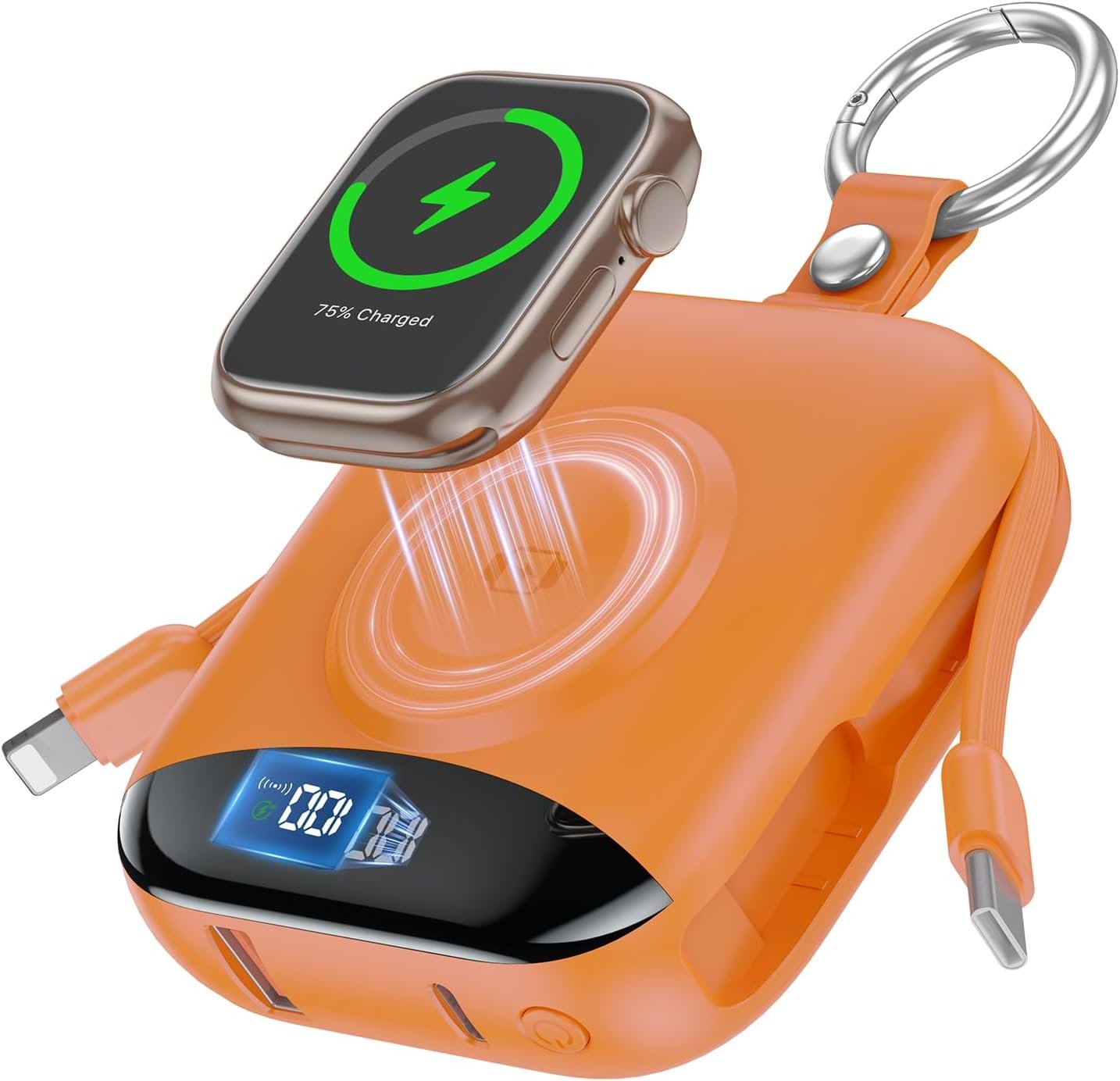 【𝐉𝐔𝐈𝐂𝐄 𝟒 𝐃𝐄𝐕𝐈𝐂𝐄𝐒 + 𝐢𝐖𝐀𝐓𝐂𝐇 𝐂𝐇𝐀𝐑𝐆𝐈𝐍𝐆】▸Built-in iOS and USB-C cables mean you are never hunting for cords any more, plus with 2 USB ports make the portable phone charger to juice 5 devices simultaneously—Including your iWatch, iPhone, iPad, or camera. The 3.5W fast iWatch charger(magsafe not for phones) is fully compatible with iWatch Series 11/10/9/8/7/6/SE/5/4/Ultra/Ultra 2, and charging your iWatch to 33% in just 30 minutes