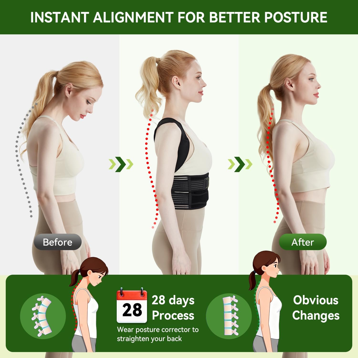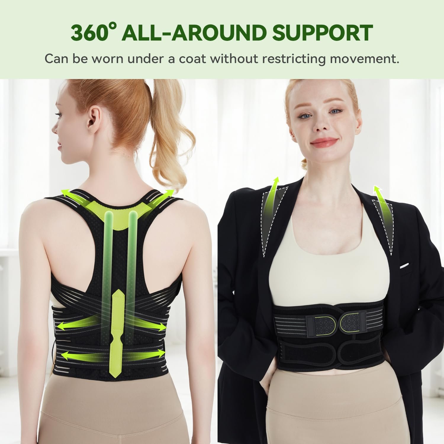 Custom-Size and Adjustable: The back posture corrector women features multiple adjustment points at the shoulders and waist, providing a truly personalized fit for different body types (both men and women). Reinforced wide straps ensure secure and comfortable tension control. Simply adjust according to the waist size guide to find the support level you need, from gentle reminders to strong support.