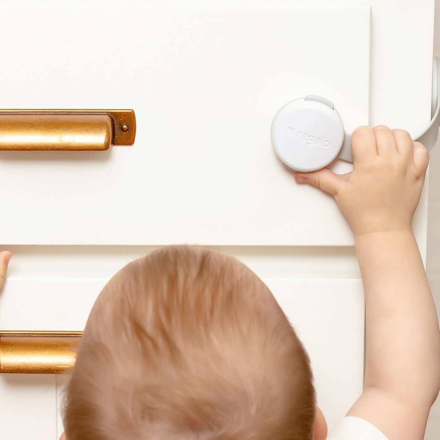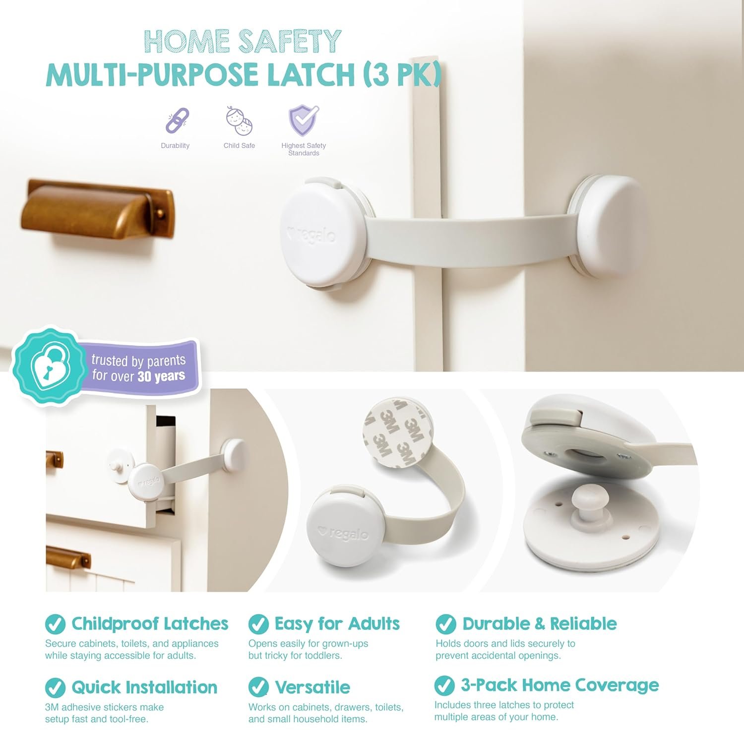 Create a safer home with the Regalo Safety Multi-Purpose Latch, designed to help baby proof cabinets, drawers, refrigerators, toilets, and household doors. This versatile door lock latch provides an effective way to prevent toddlers from opening storage spaces and accessing unsafe or off-limits items. Perfect for kitchens, bathrooms, nurseries, and playrooms, these child proof cabinet locks work as a secure cabinet lock, drawer latch, or even a fridge lock for added peace of mind. The strong adhesive design allows for quick, parent-friendly installation while keeping the latch difficult for little ones to operate. With a convenient 3-pack, Regalo Safety latches are an essential addition to your baby safety products collection and a smart step in completing your baby proofing checklist. Designed by parents, for parents, Regalo Safety products help families create safer spaces for babies and toddlers at home. American designed and family owned, Regalo is a trusted U.S.-based brand that has delivered dependable child safety products and baby proofing essentials for over 30 years.