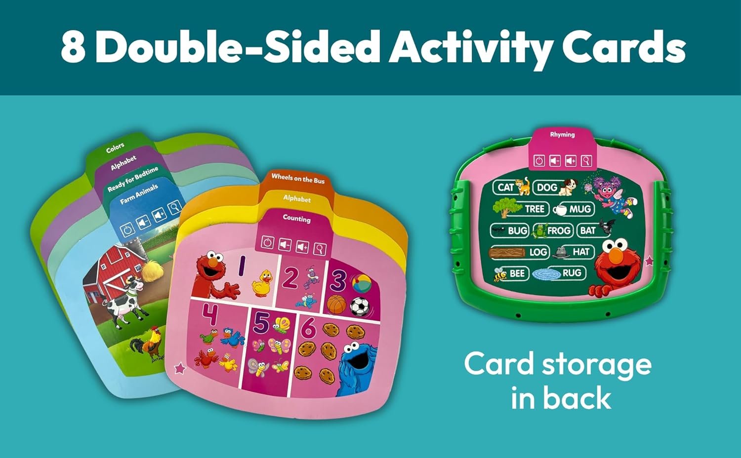 Read, learn, and play with Elmo and Sesame Street! 8 two-sided activity cards slide into the electronic activity pad for 16 big busy scenes full of fun. Each activity card focuses on early learning themes and Elmo speaks with almost every touch. Choose any card and begin touching the learning tablet to activate sounds, facts, questions & answers, and activities. The card reader reinforces early learning essentials in a fun and interactive way that engages and motivates children. Activities include ABCs, numbers counting, animals, colors, shapes, music, rhyming, and more for hours of playing and learning! Cards are stored in the back of the tablet making them easy to track and to take on the go. No computer or internet hook-up is necessary!