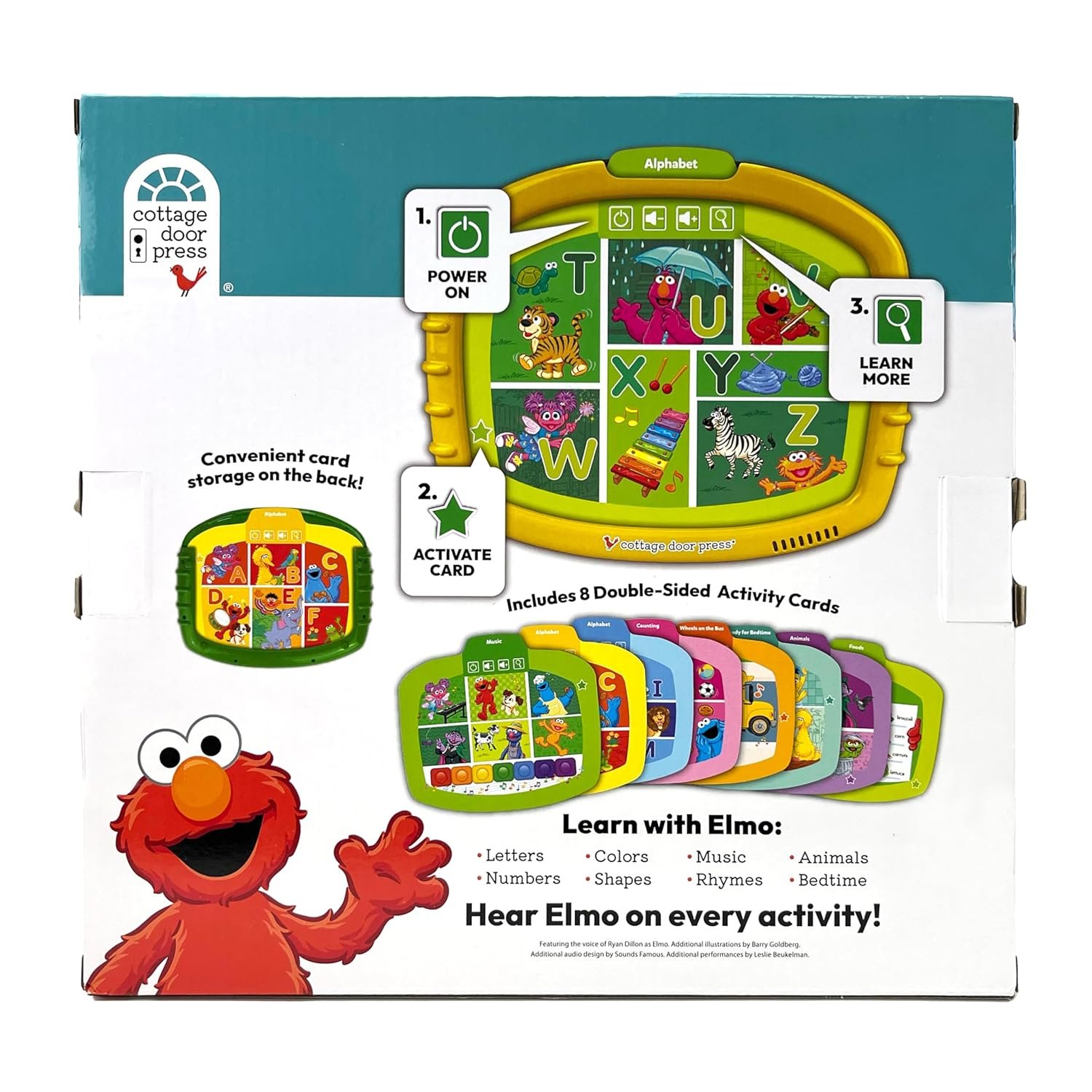 FEATURES ELMO’S VOICE! Hear Elmo on every activity as he talks about letters, colors, music, animals, numbers shapes, bedtime and more!