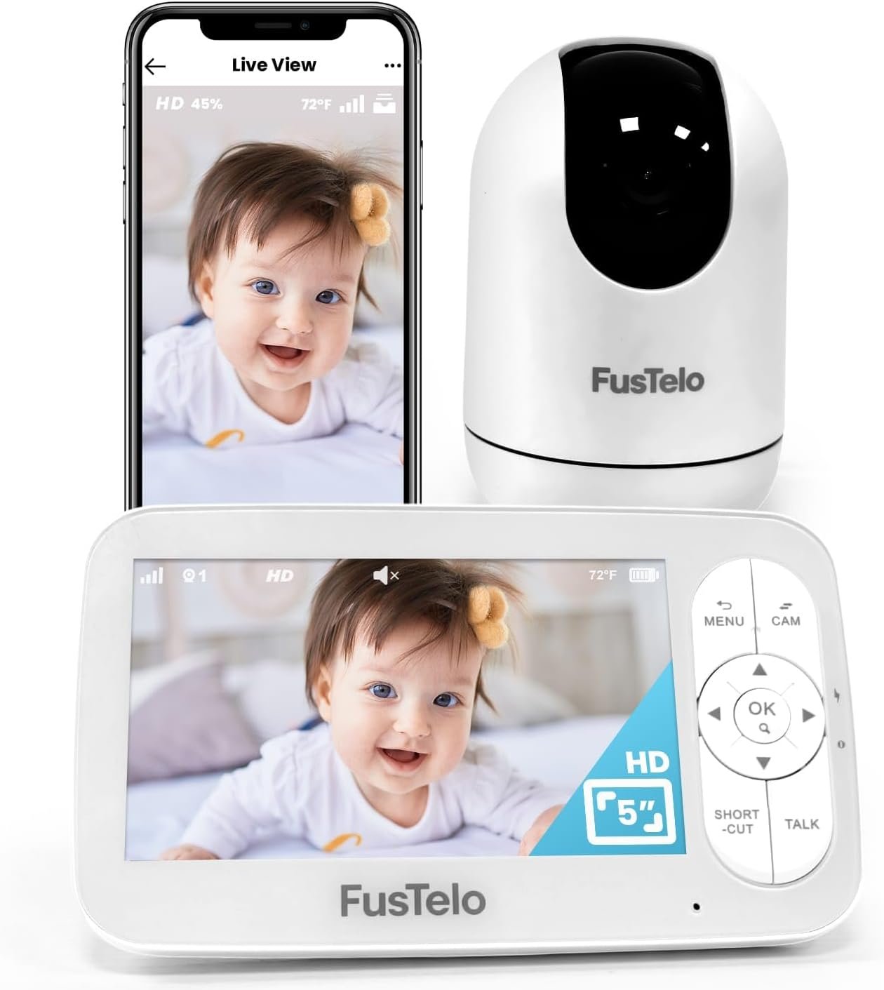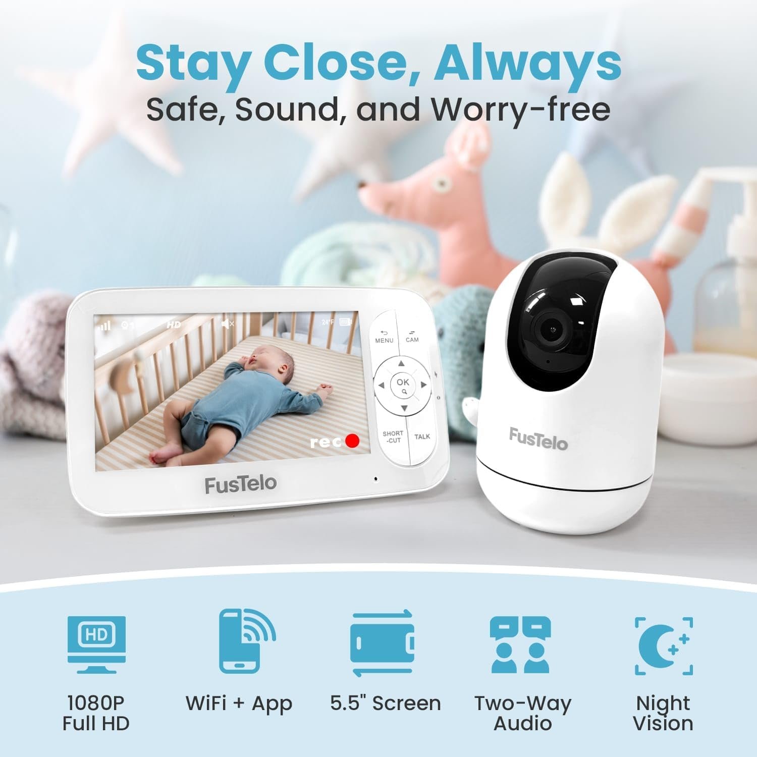 Smart WiFi Baby Monitor with 5” OLED Screen & Camera, 1080P HD, 360° Pan/Tilt, 4X Zoom, Two-Way Audio, Cry & Motion Alerts, Night Vision, Temperature Sensor, Long-Battery, App & Screen View