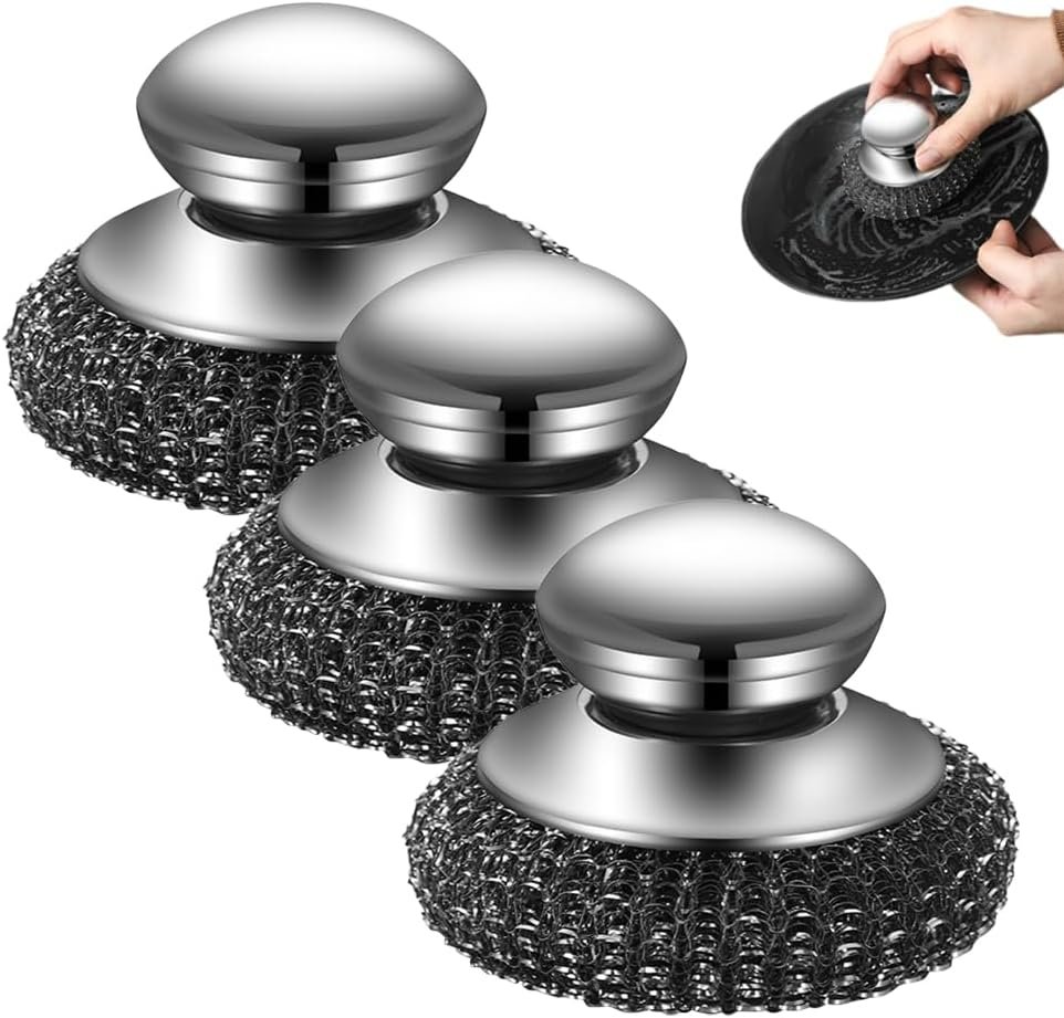 Steel Wool Scrubber with Handle, Upgrade Heavy Duty Stainless Steel Dish Scrubber for Cleaning Dishes, Iron Pots, Stoves, Kitchen Sink (3 pcs)