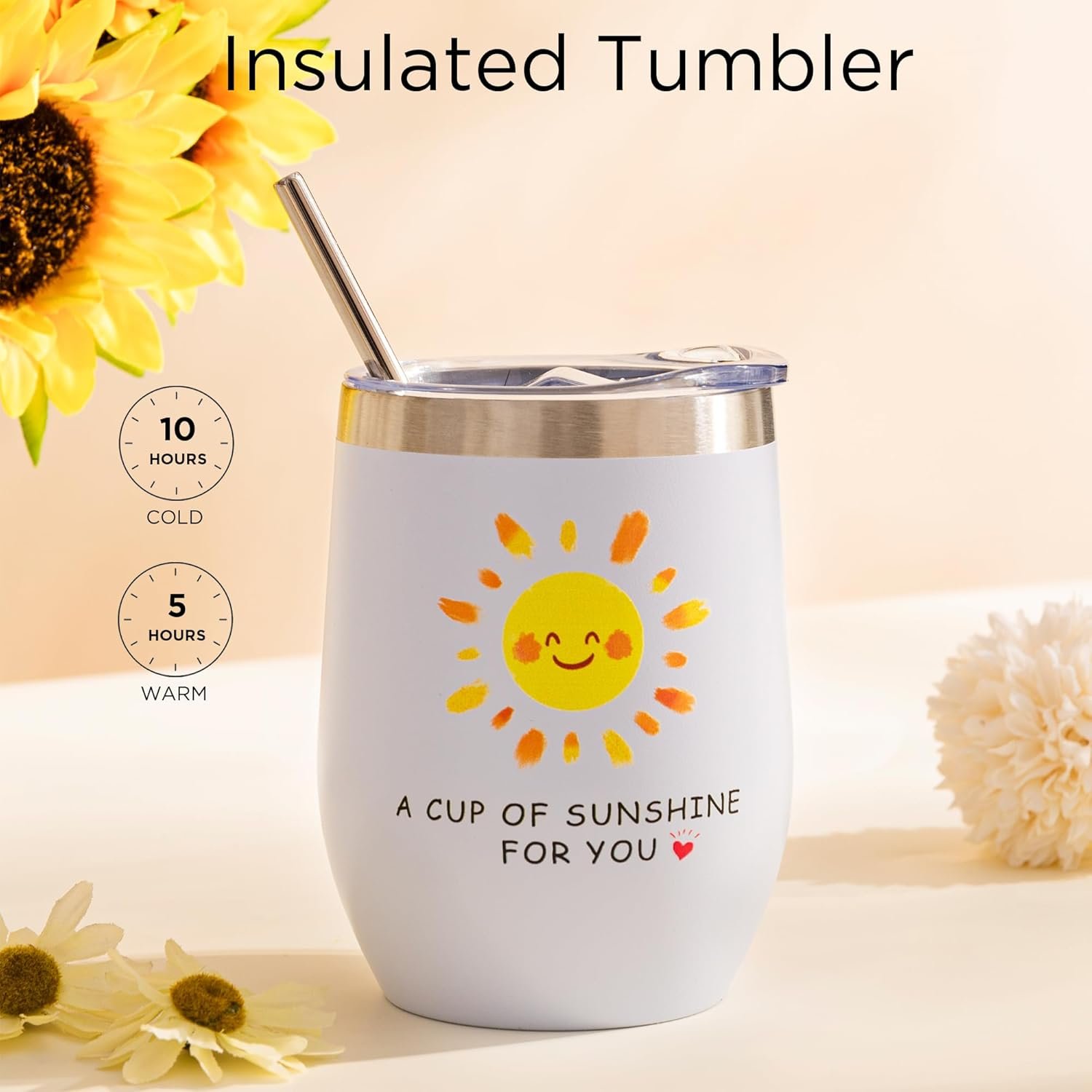 1 x 20oz insulated coffee tumbler: with the words “A CUP OF SUNSHEINEFOR YOU,so this is your reminder”, keeps cold up to 12 hours and hot up to 6 hours