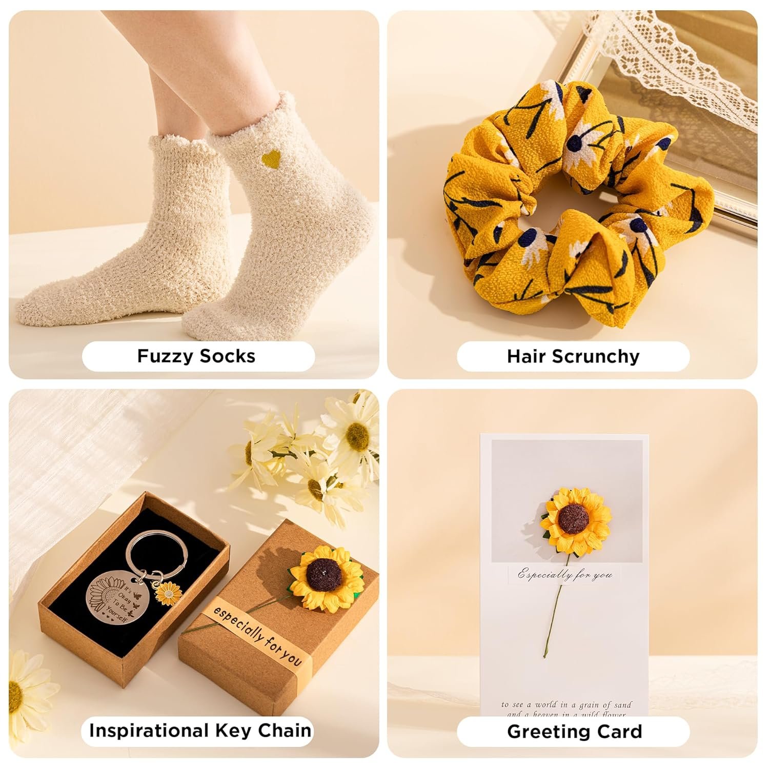 Gifts For Women Who Has Everything:The unique sunflower gift baskets for women contains 9 handpicked pieces: 1 x 12 oz insulated stainless steel tumbler, 1 x soy wax flower scented candles, 1 x Sunflower Key Chain, 1 x fuzzy socks, 1 x Silk Eye Mask, 1 x Hair Scrunchy,, 1 x birthday greeting card, 1 x gift box. The cozy Care Package for Women has been meticulously curated and handpacked with love!