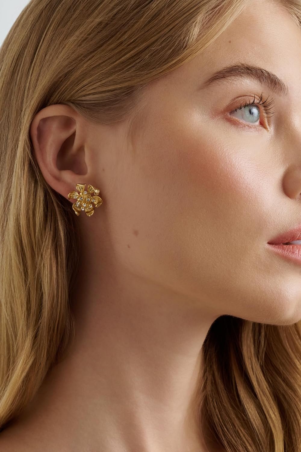 Multiple views of delicate gold-toned bow-shaped jewelry pieces with crystal embellishments against white backgrounds.Multiple views of delicate gold-toned bow-shaped jewelry pieces with crystal embellishments against white backgrounds.