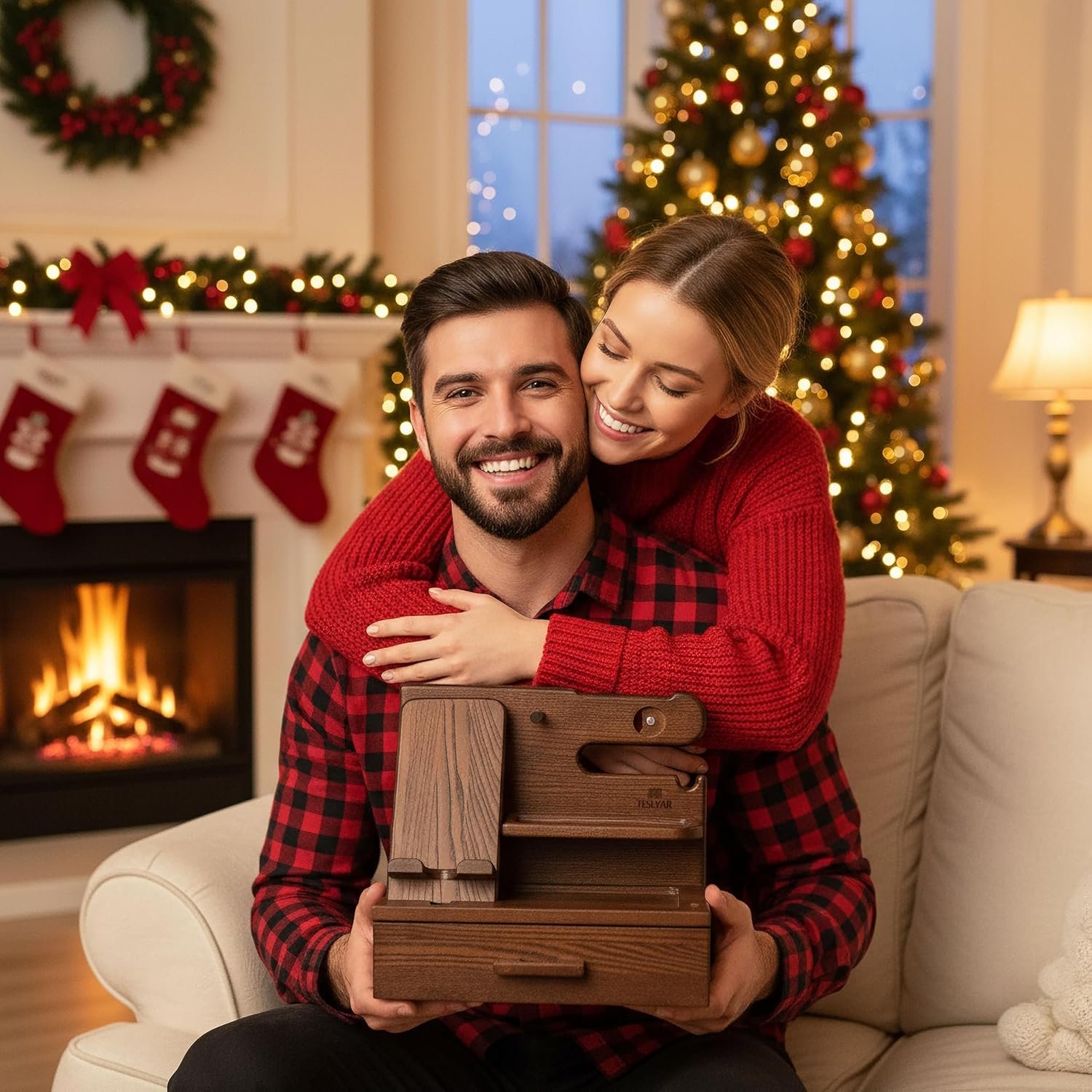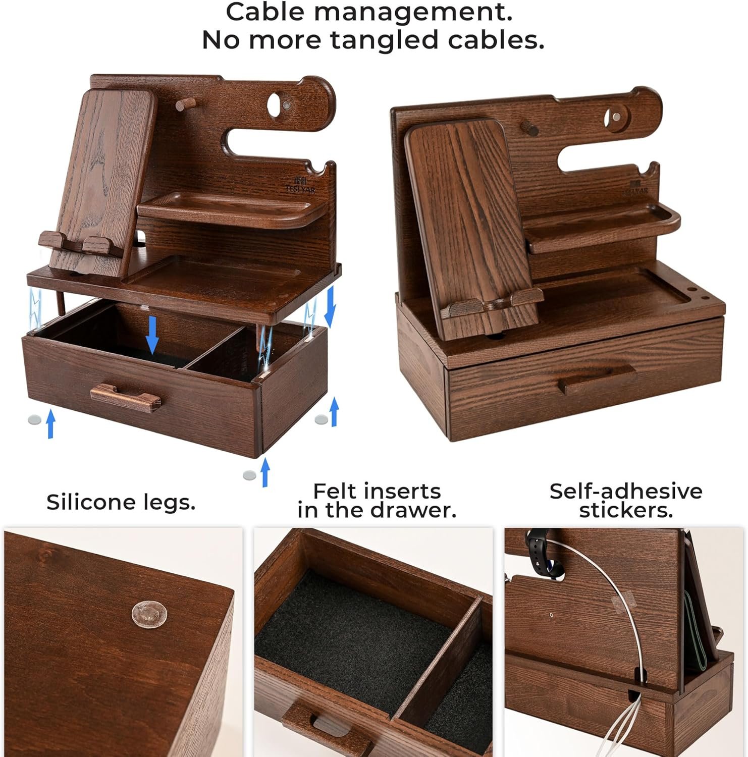 TESLYAR Wood Phone Docking Station with Drawer – Nightstand Organizer – Desk Organizer for Husband – Birthday Gifts for Men, Dad, Anniversary Idea, Key Holder Stand Watch & Accessories (Bourbon Brown)