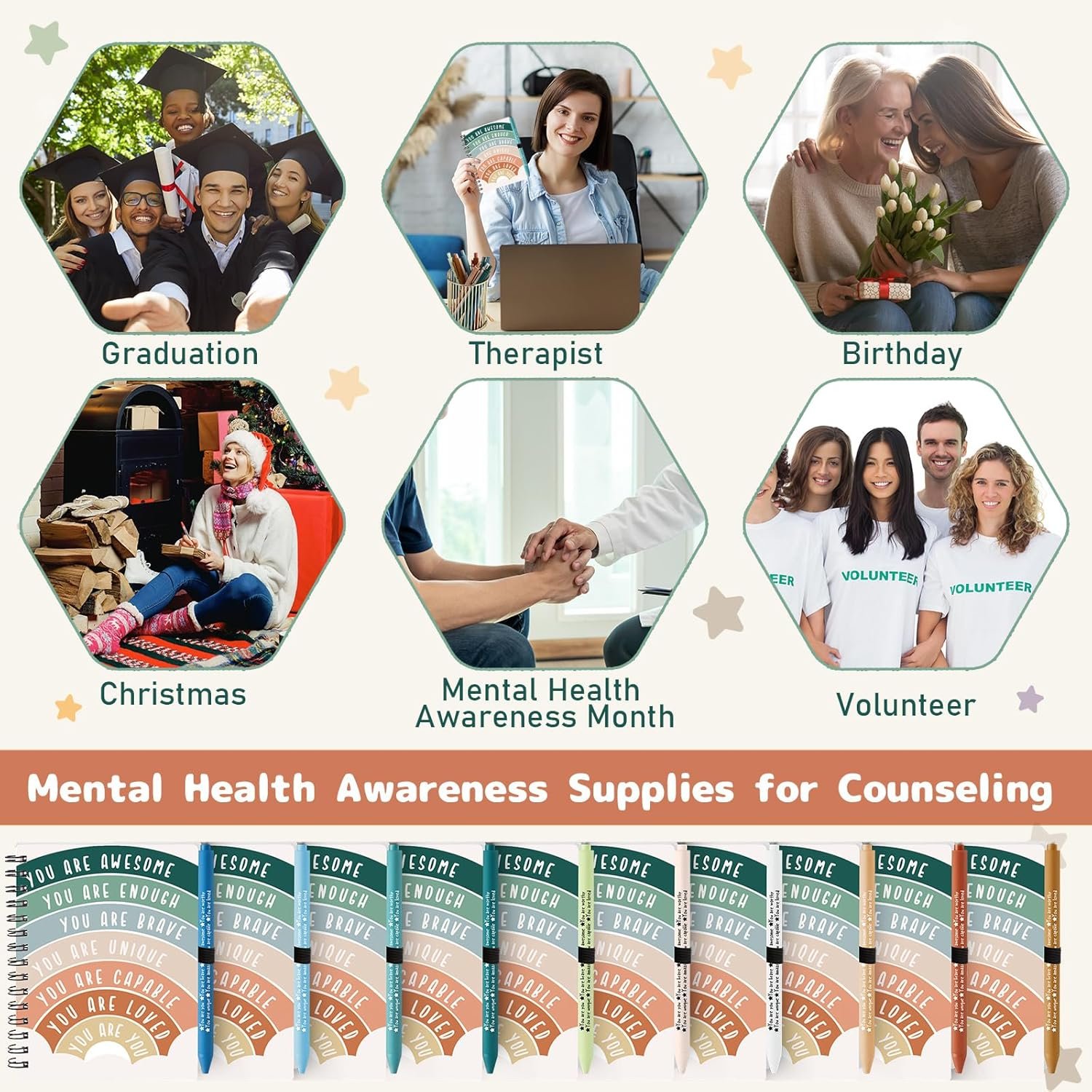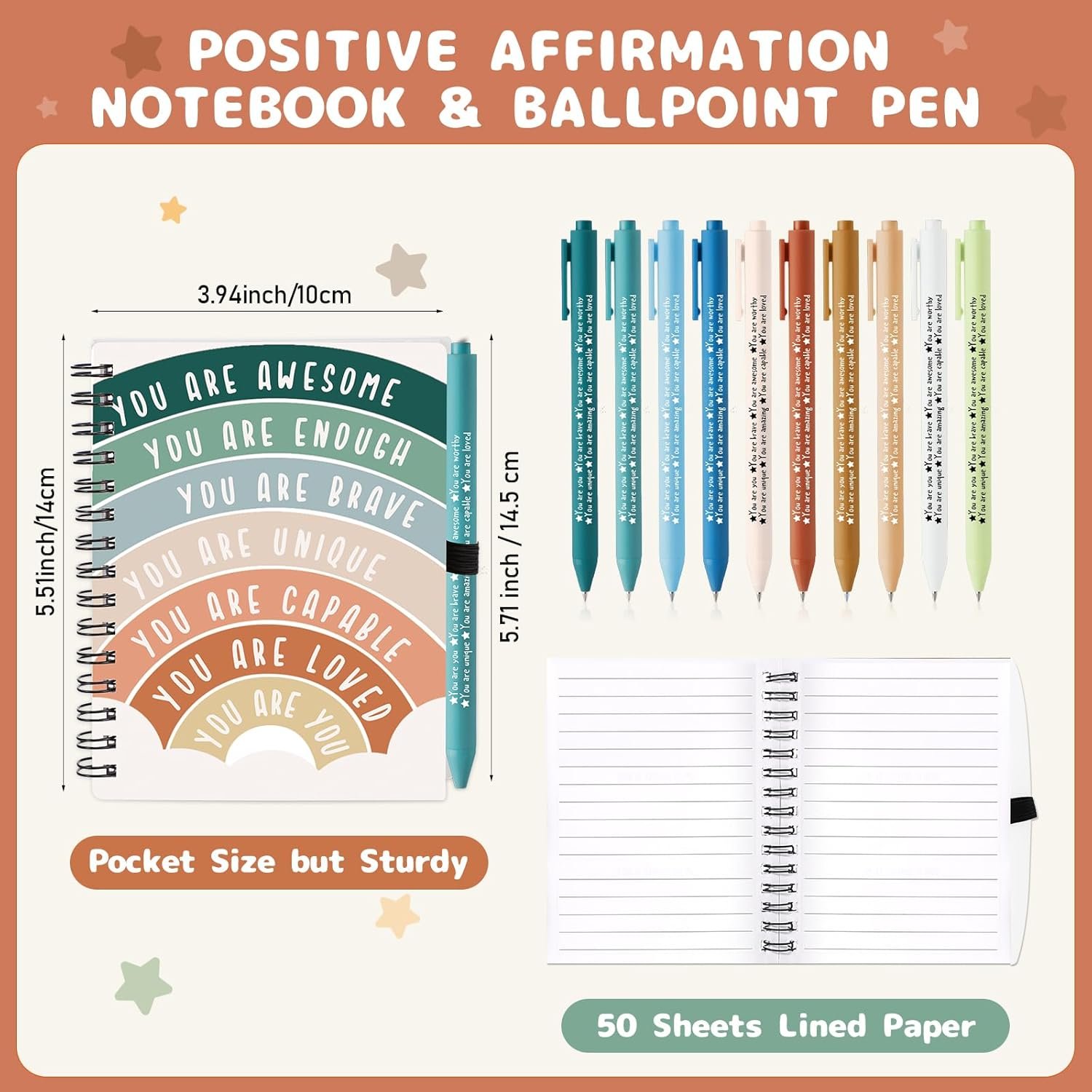 Package Included: comes with 20 pieces positive affirmation journals (50 double-sided lined pages) and 20 pieces positive affirmation pens in boho colors, perfect for counseling office supplies, classroom must haves and wellness gifts for therapist, psychologist and school counselor, etc