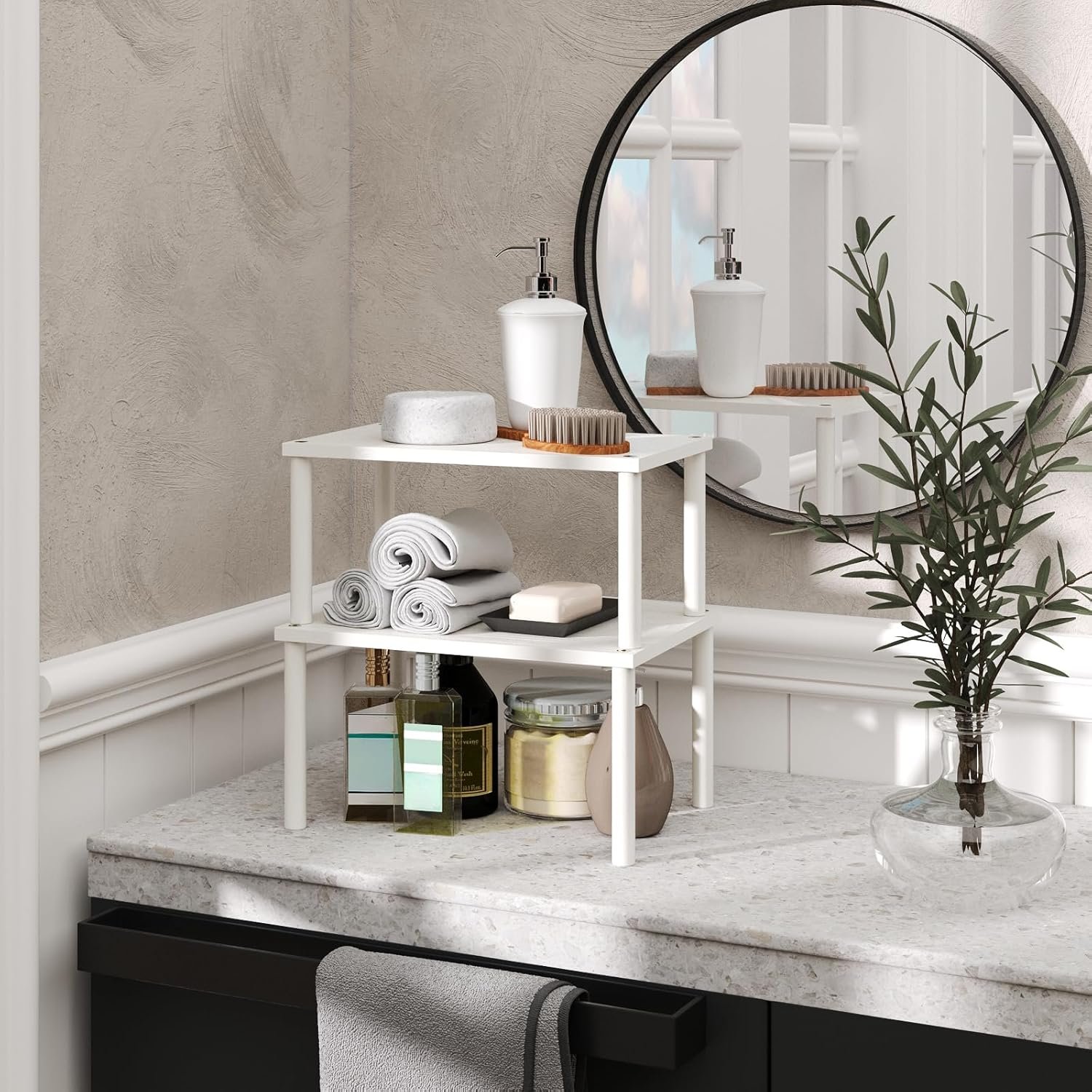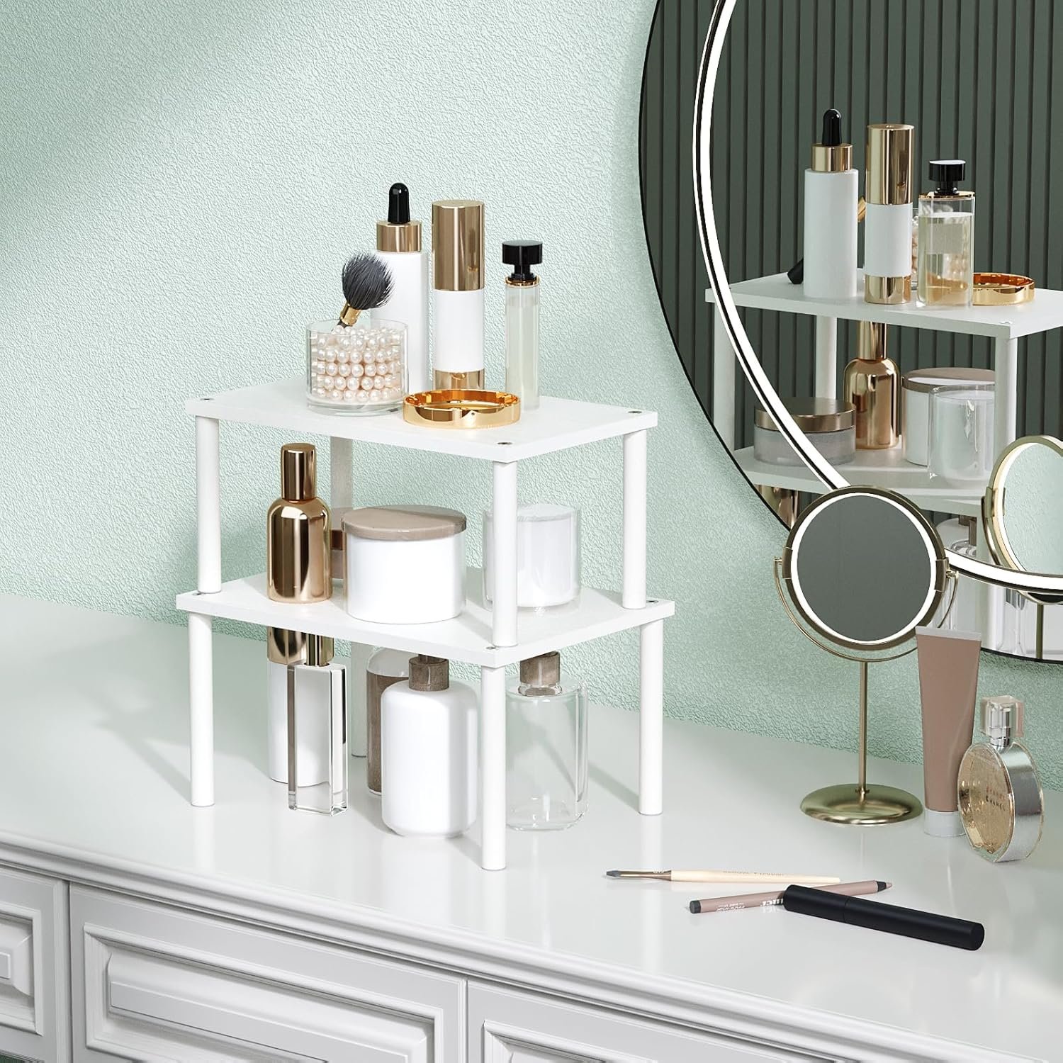VERTORGAN Cabinet Organizer Shelf(Set of 2),Kitchen Counter Shelves,Bamboo Spice Rack Countertop and Cabinet,Stackable Expandable,Medium,(White)