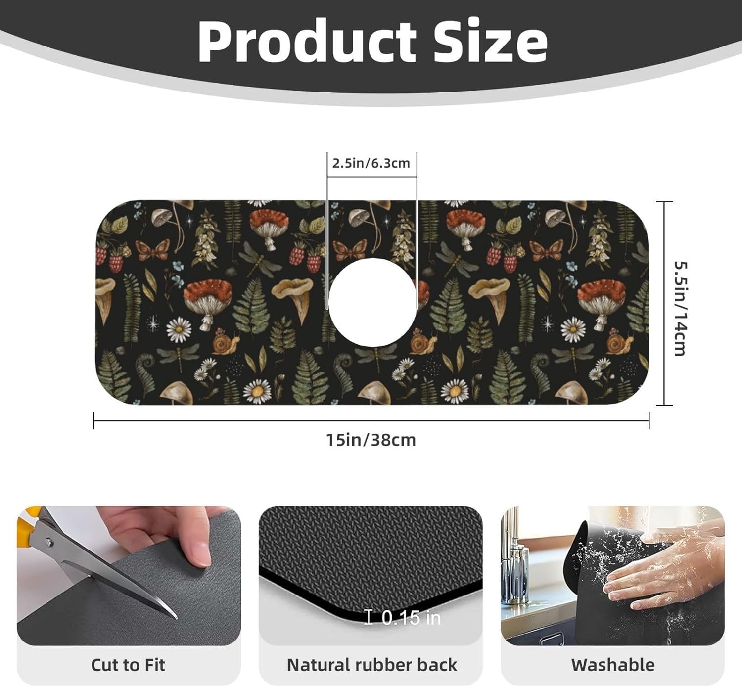 Size: 15 x 5.5 inch, The hole diameter is 2.5in, can be applied to most of the faucets, You can also cut this faucet sink mat by yourself to fit your countertop and faucet.Rubber backing prevent water flowing underneath and mess up your countertop