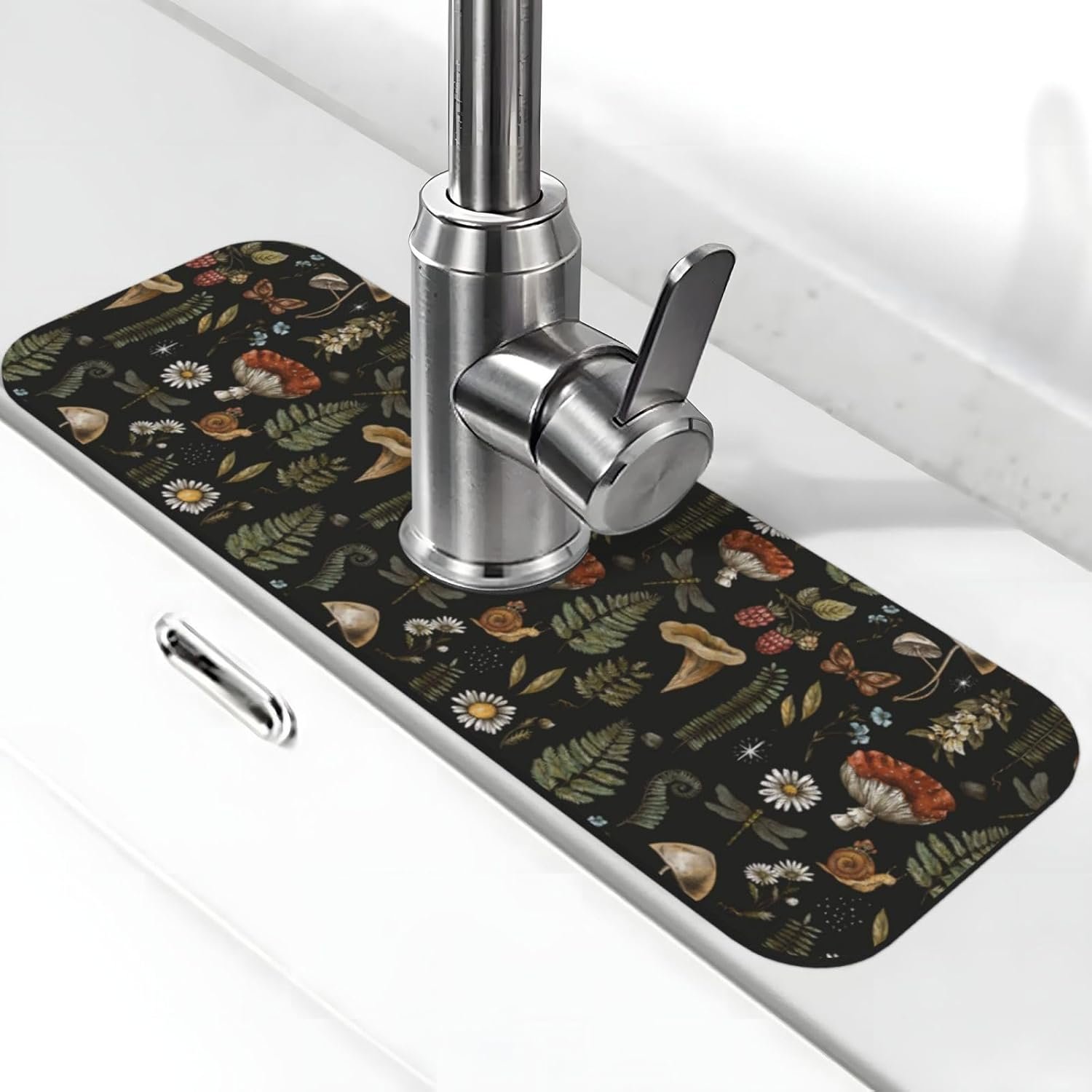 Vintage Magic Witch Mushroom Fern Witchcraft Kitchen Sink Splash Guard Faucet Mat Super Absorbent Fast Drying Mat Sink Gadgets-Fast Drying Pad Sink Mat For Kitchen Bathroom (15″ X 5.5″ )