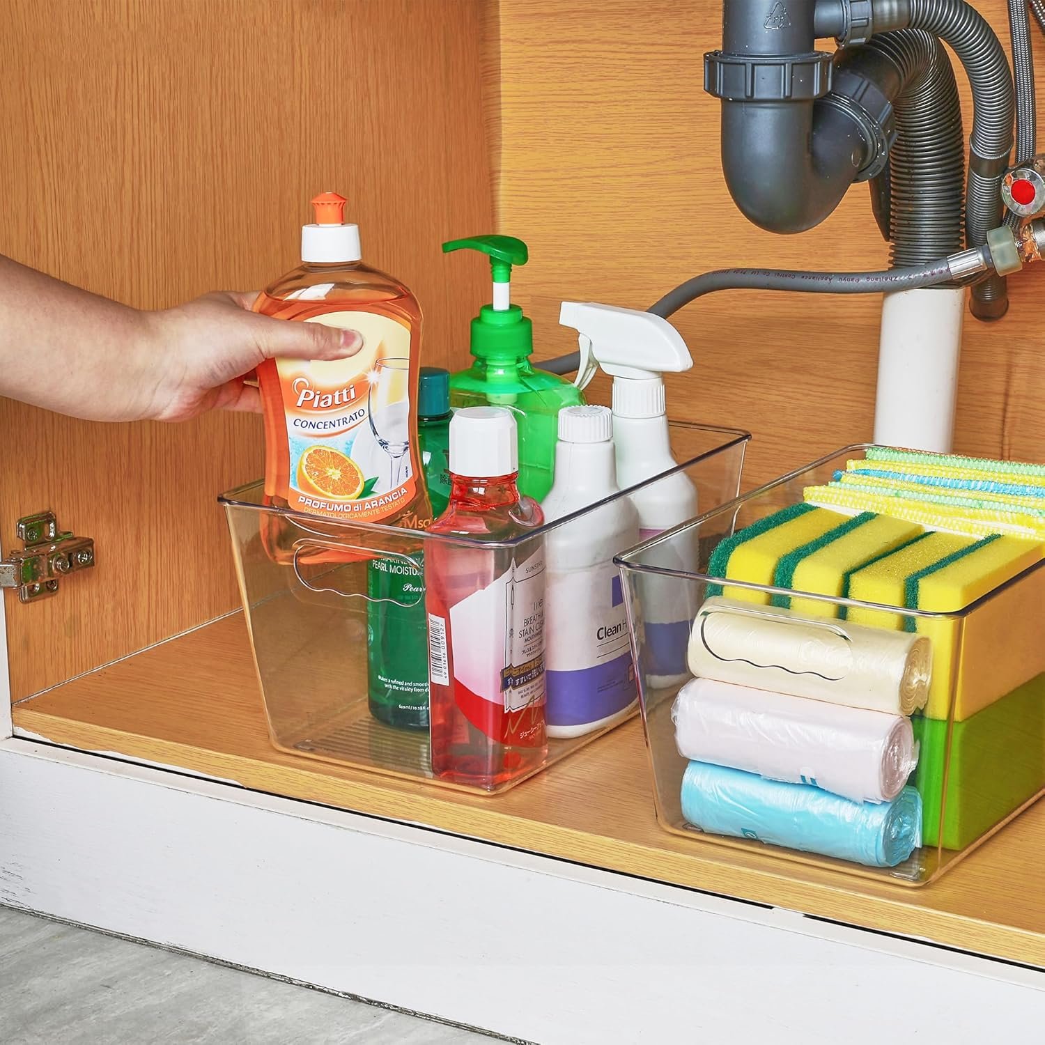 Built-in Handles —- The bins have handle grips on the edge making it easy to carry and access contents. You just take the bins out and get the items you want, then put it back in so simple. Organize all of your kitchen essentials to make organizing and everyday living with ease, creating a clean and organized home.