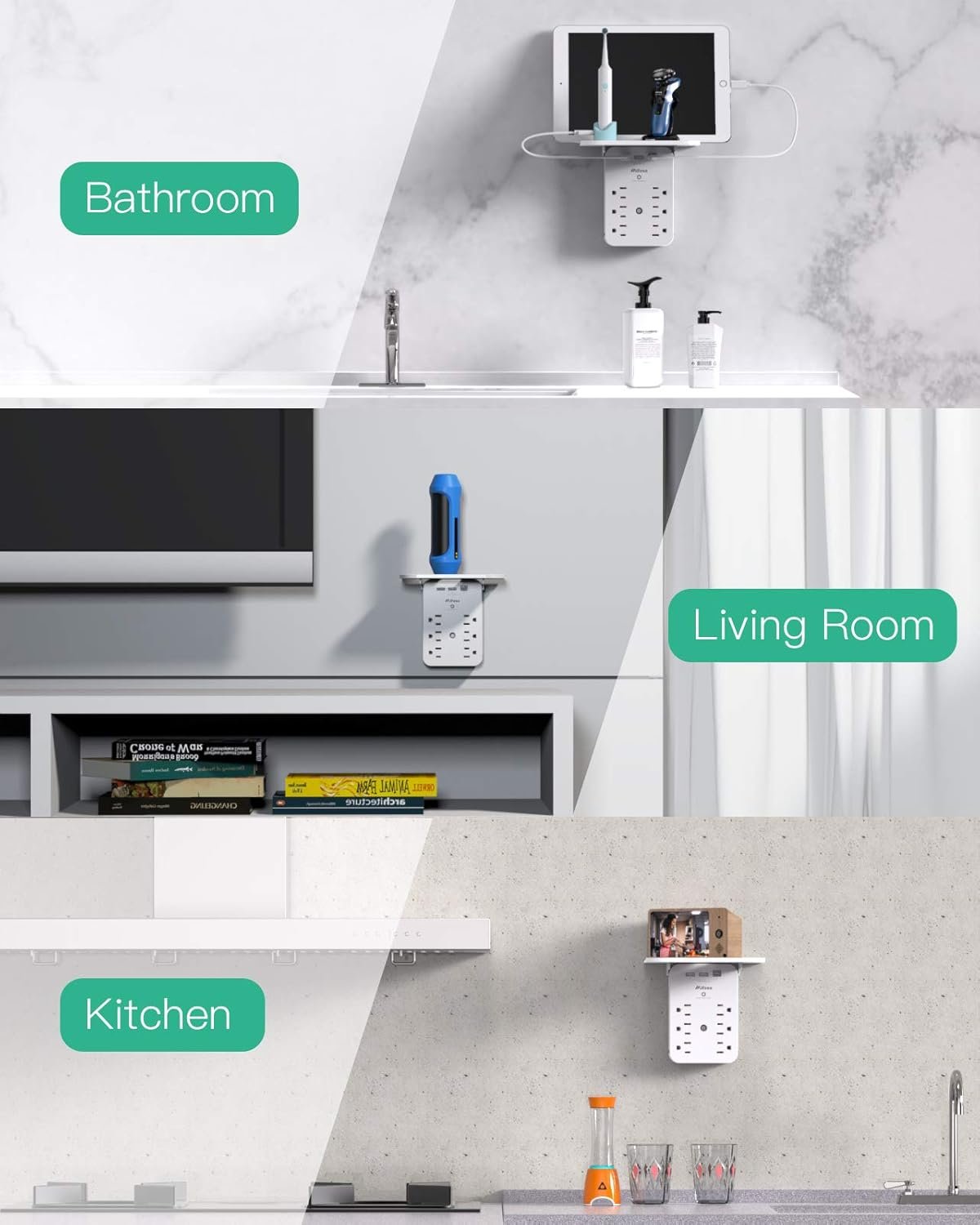 【Easy installation & Warranty】Just plug the surge protector into a standard grounded duplex wall receptacle and you’re ready to go. Please NOTE: Please make sure the type of your outlets when if you want to use it in the bathroom or kitchen.