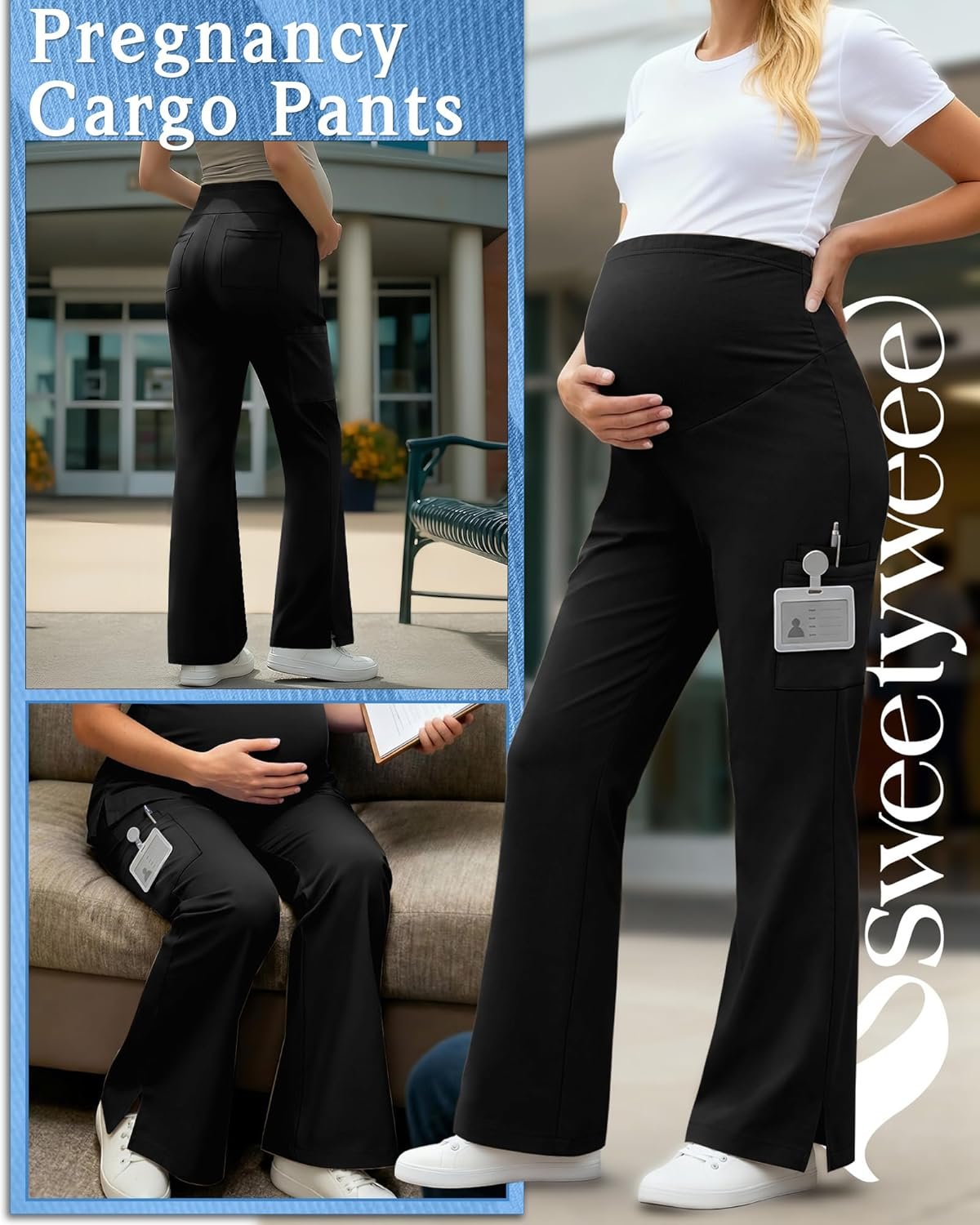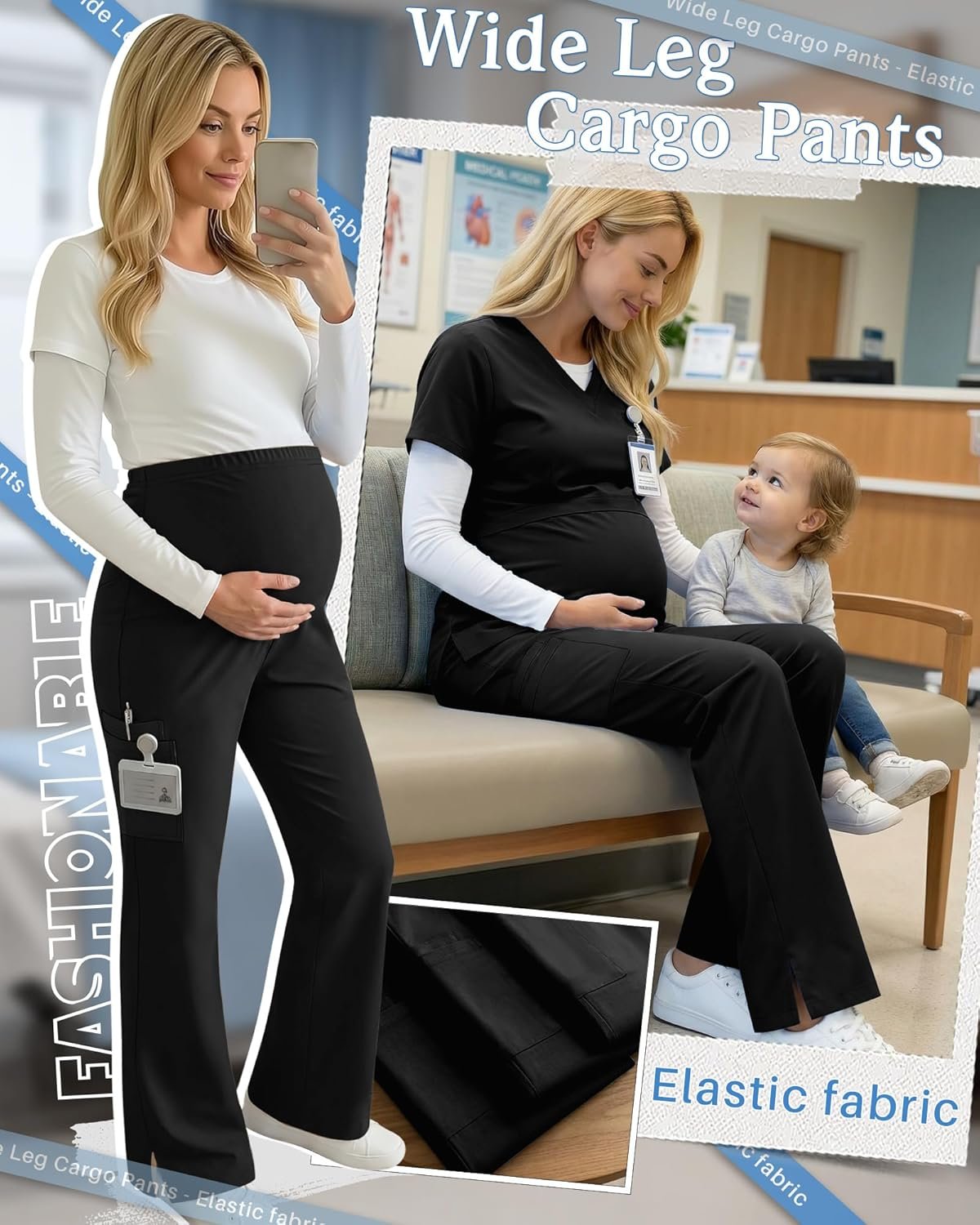Women’s Maternity Scrub Pants Wide Leg Cargo Pants Over The Belly Stretchy Workwear Pregnancy Trousers for Nurse