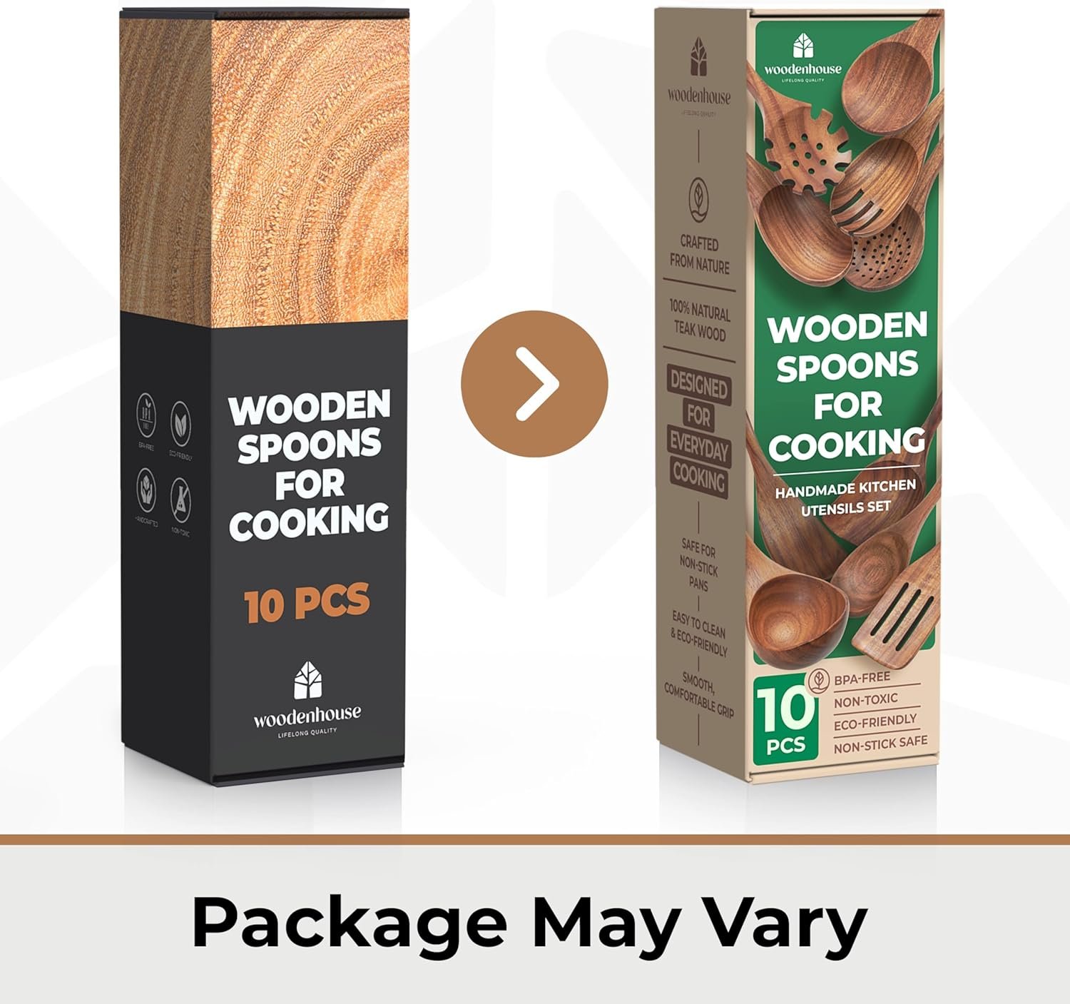 Wooden Spoons for Cooking – 10 Pc Teak Wood Utensil Set, Durable, Nonstick Safe & Heat Resistant with Ergonomic Handles